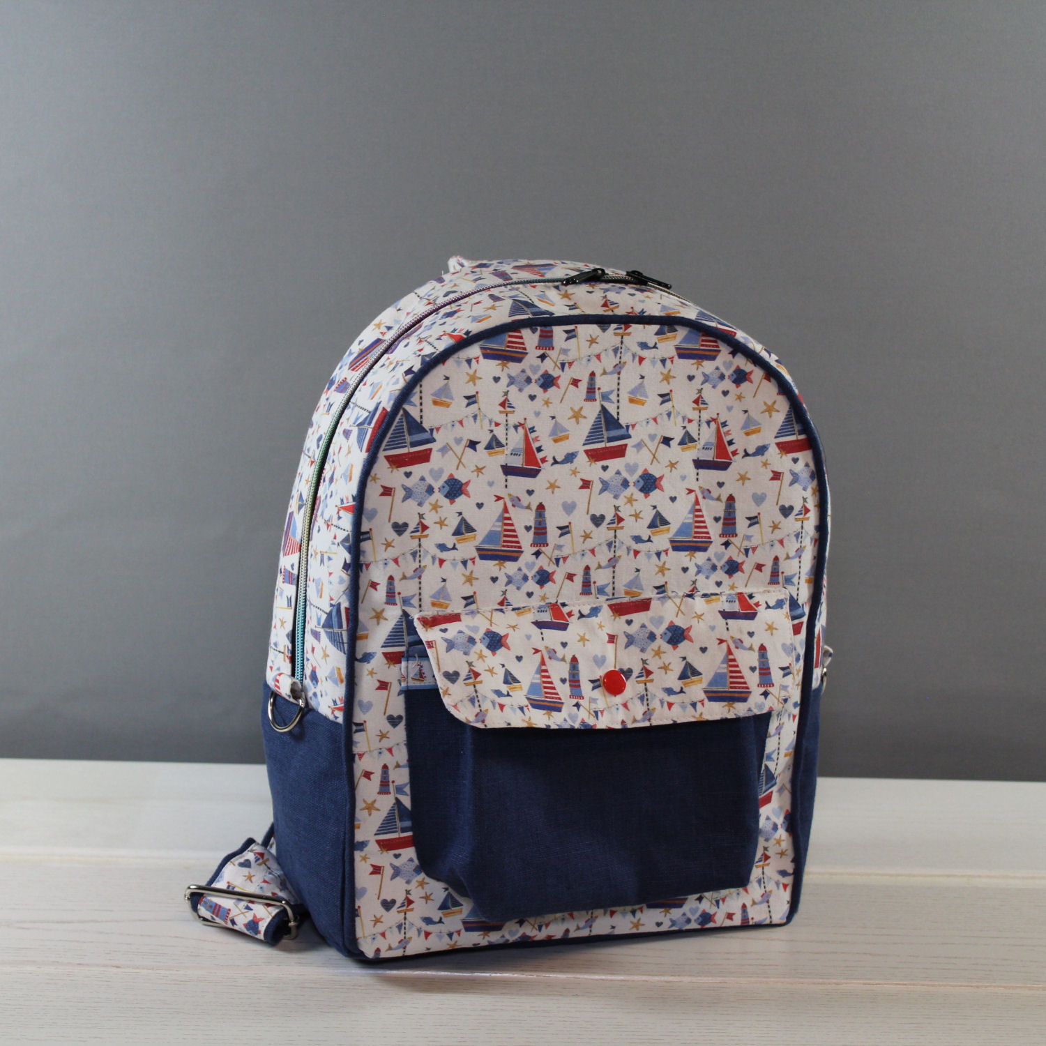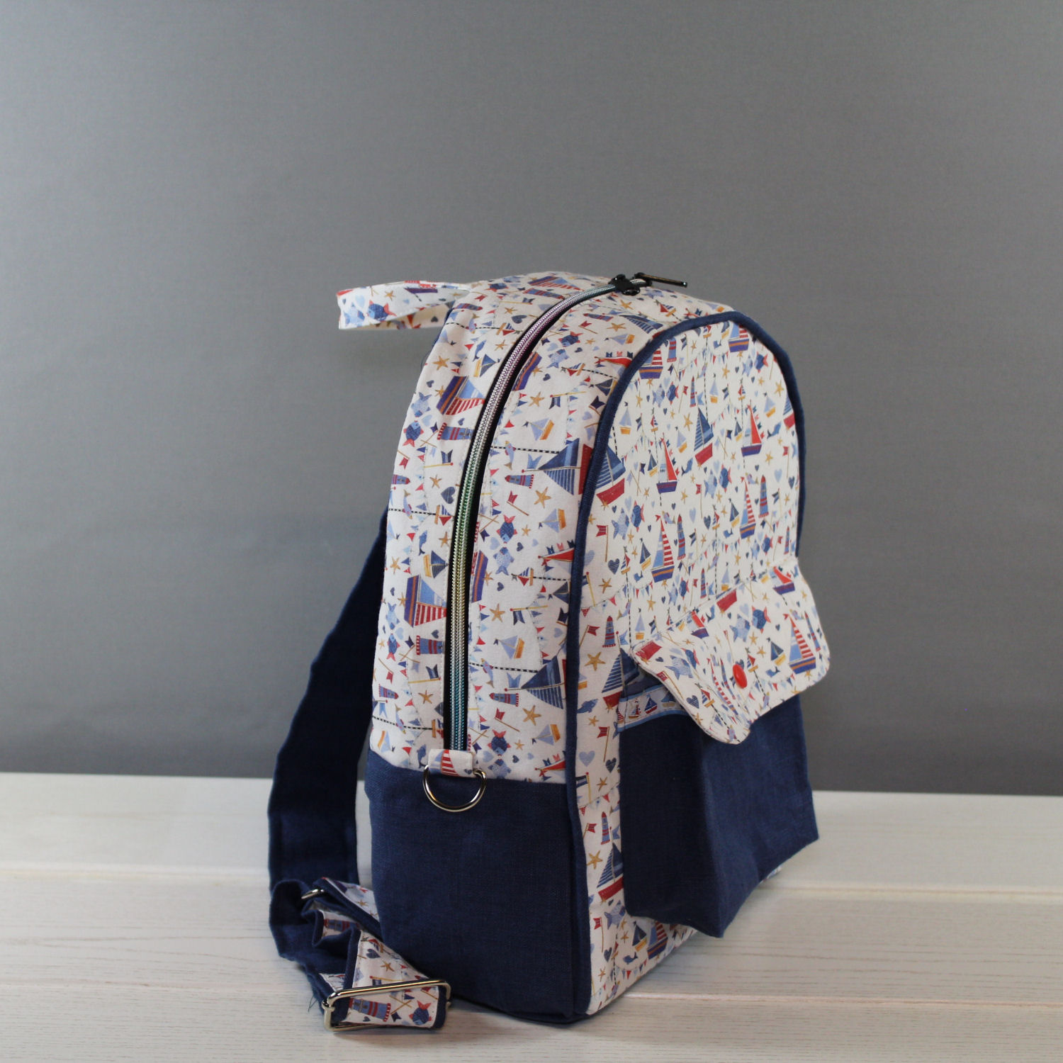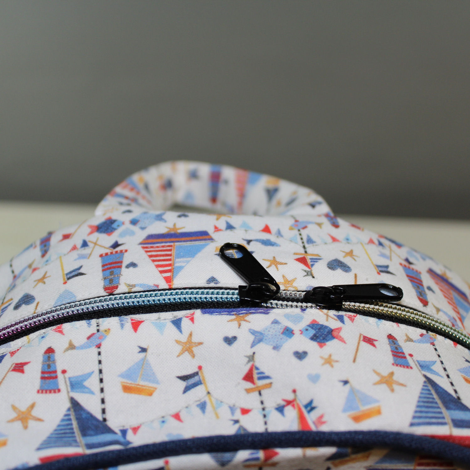 Ein lustiger Kinderrucksack in dem viele Dinge wie, Pausenbrot, Wasserflasche oder ein Kuscheltier ihren Platz finden und mit den bunten Segeln auf dem Meer auch Spaß beim Tragen macht.