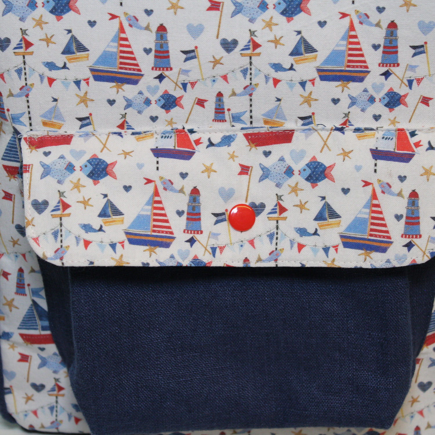 Im Innenteil befindet sich noch ein Steckfach. Auf der Vorderseite ist eine kleine Tasche aus dem blauen Leinen mit einem Umschlag aus dem Segelstoff, die mit einem roten Druckknopf geschlossen wird.