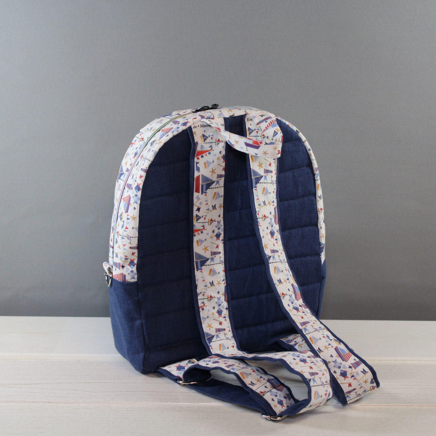 Die Rückenpartie ist aus blauen Leinen, sie ist gepolstert und abgesteppt. Die Träger sind mit beiden Stoffen kombiniert und verstellbar.