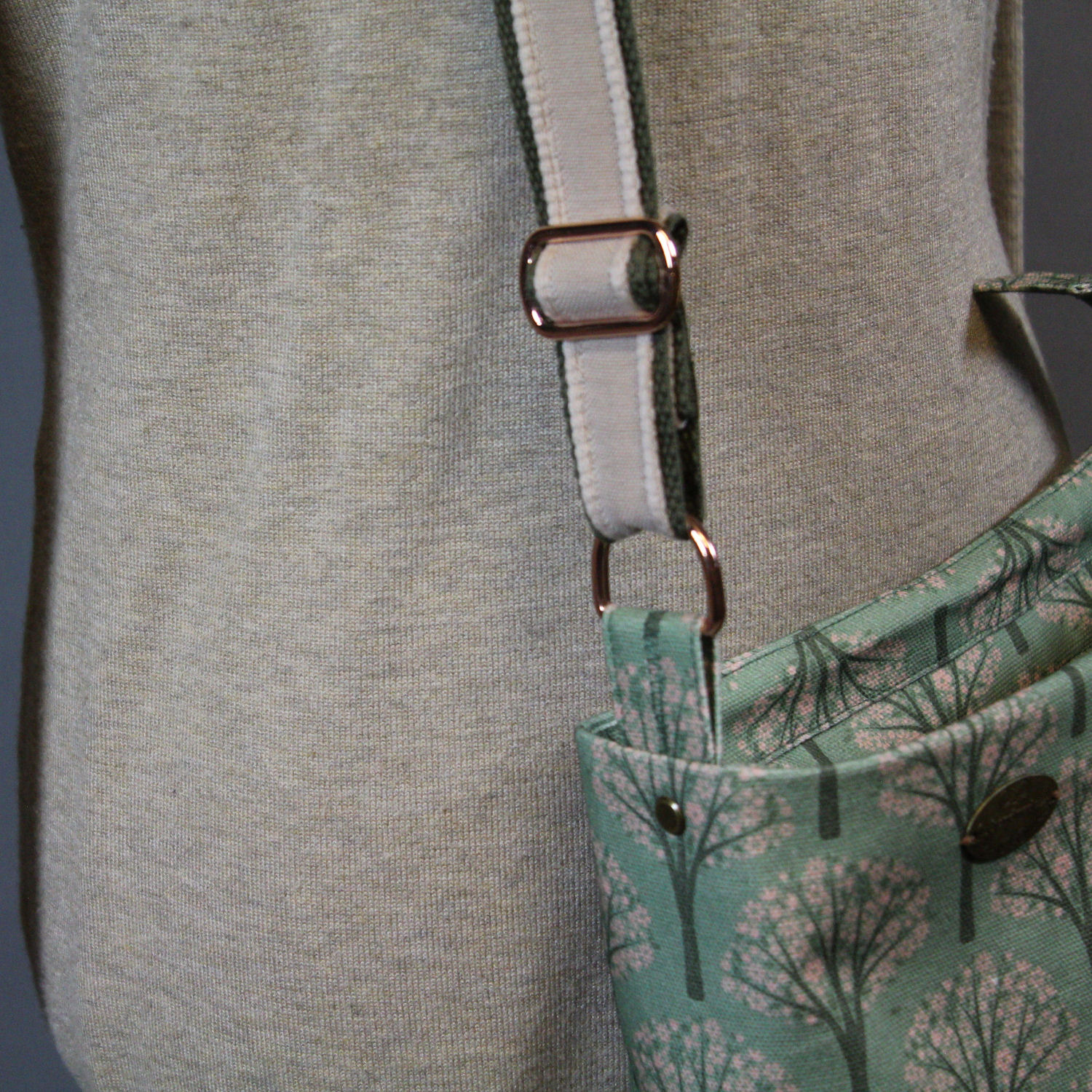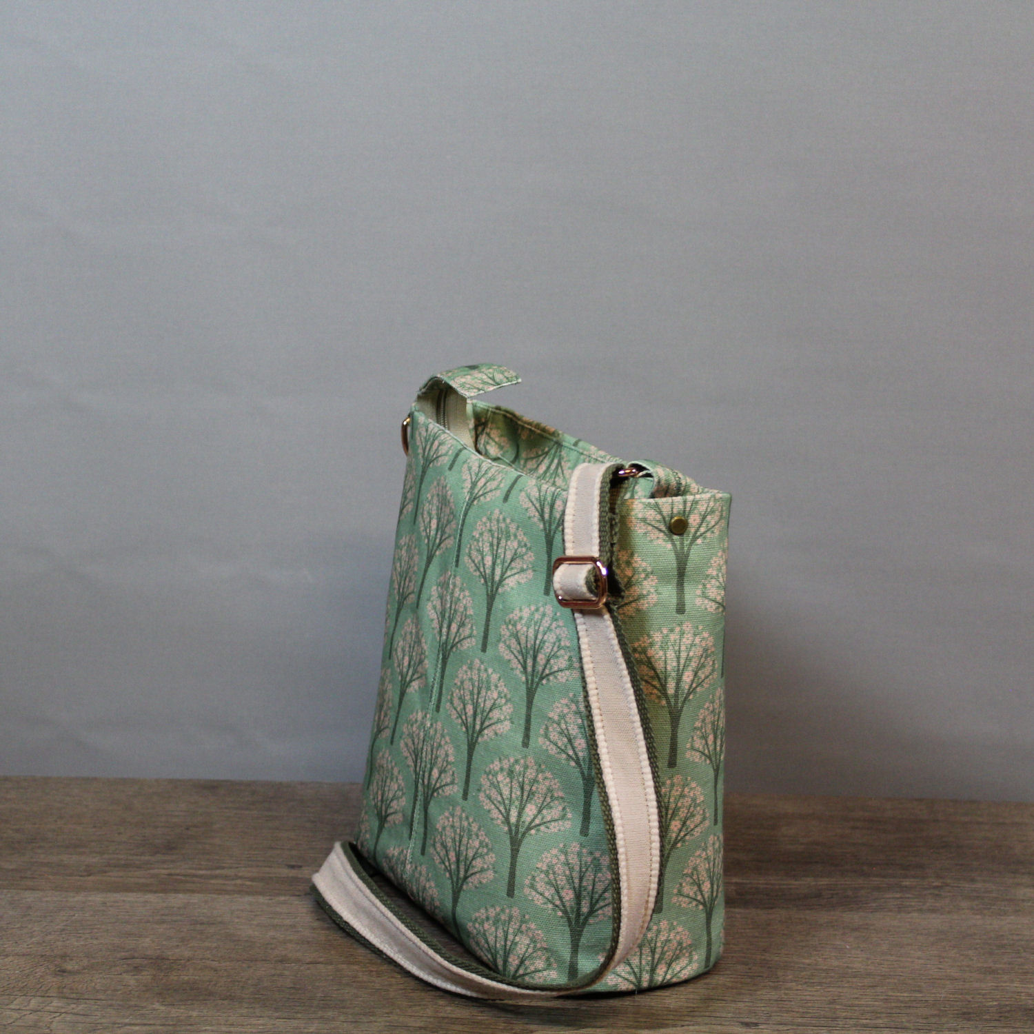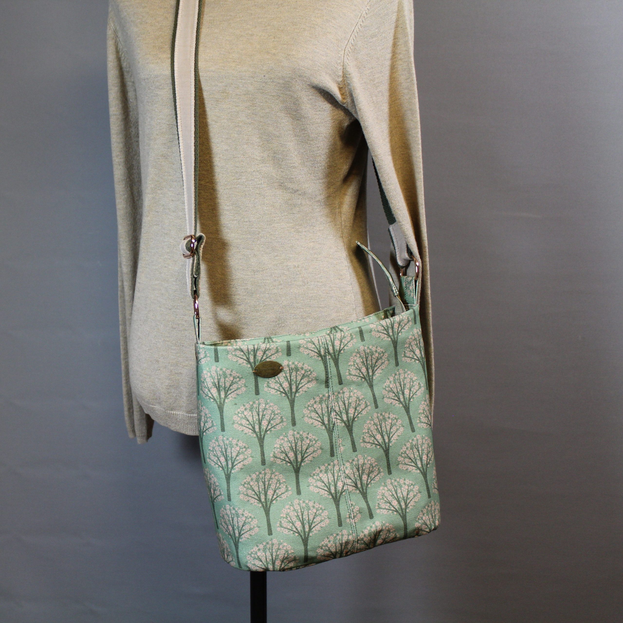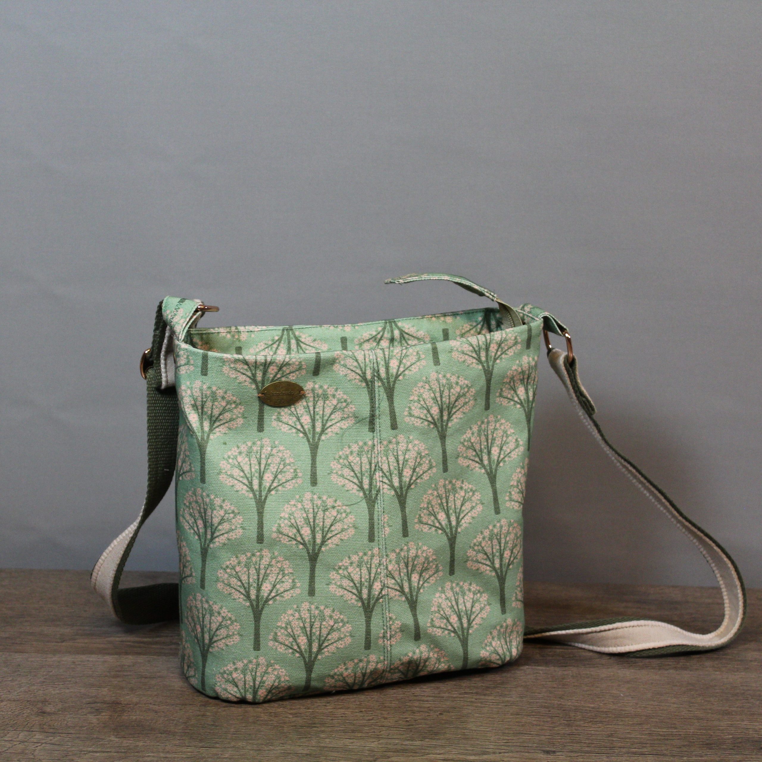 Eine Umhängetasche in mittlerer Größe aus einem hellgrünen Canvas mit Baum Motiven