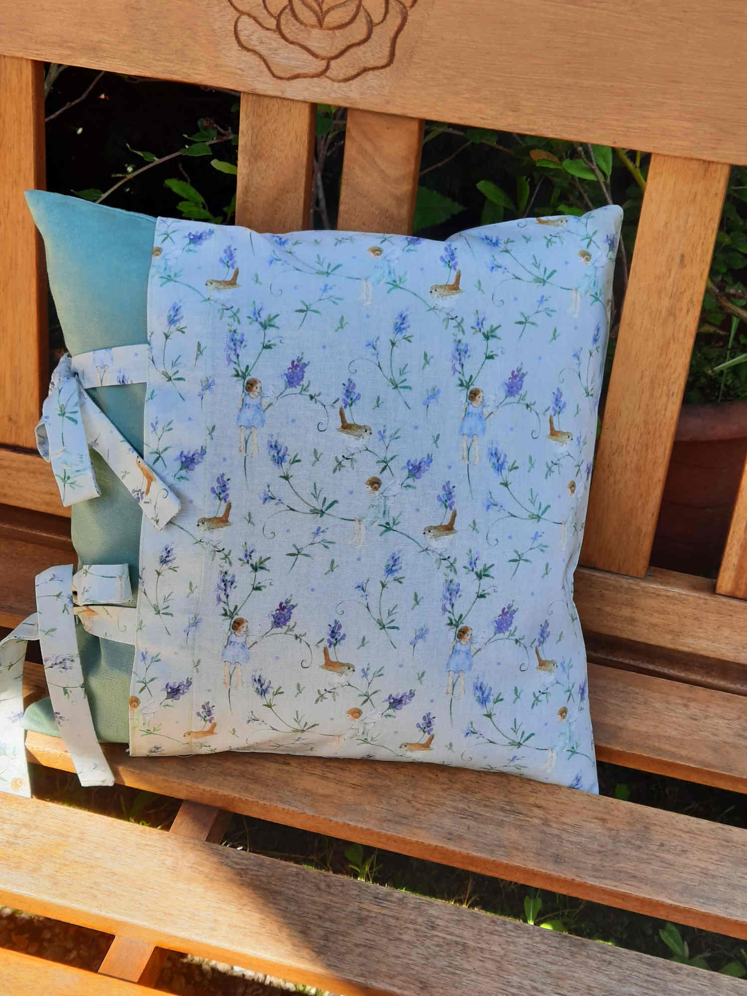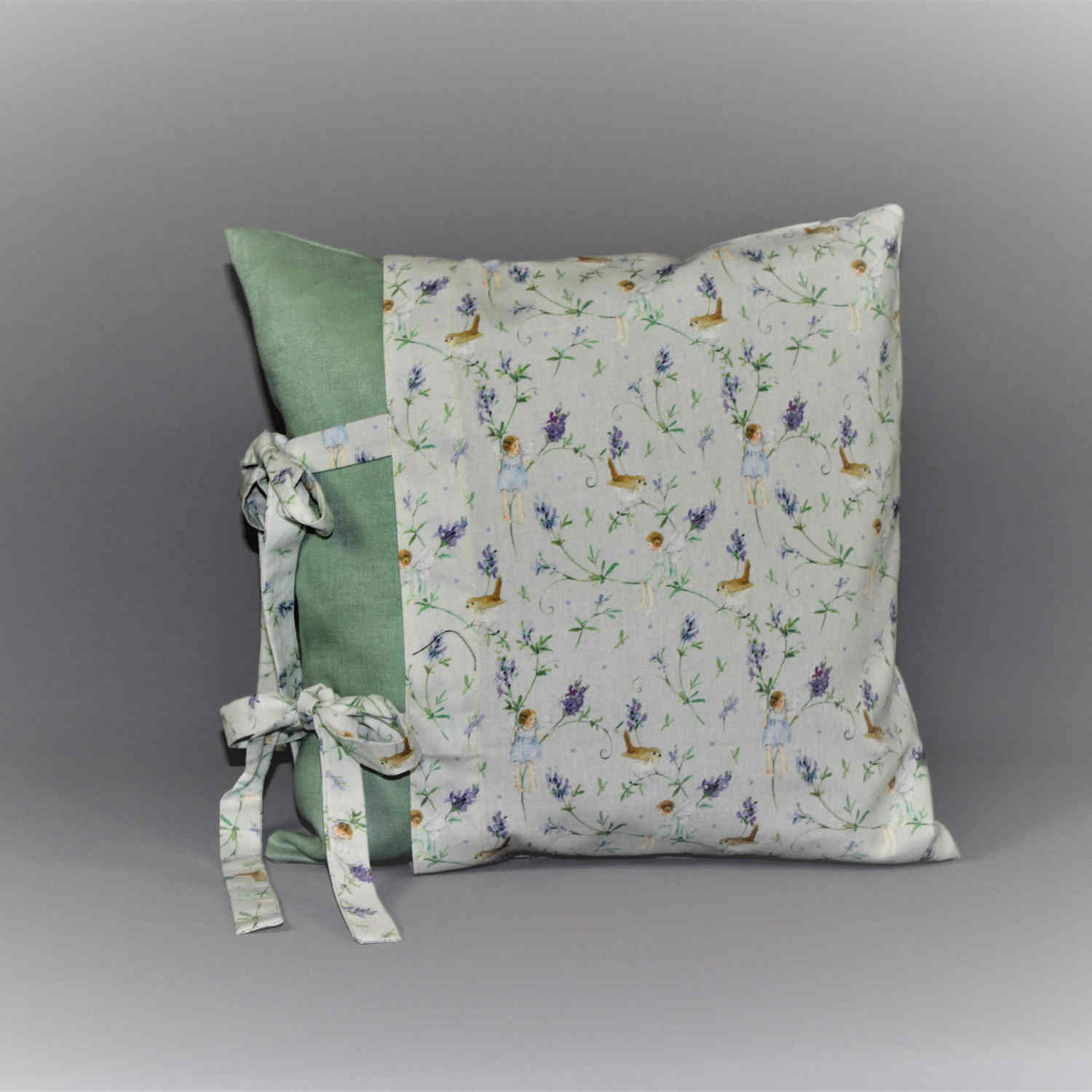Ein Dekokissen aus Baumwolle mit Elfen, Lavendel und Vögeln auf einem Hellgrünen Untergrund.