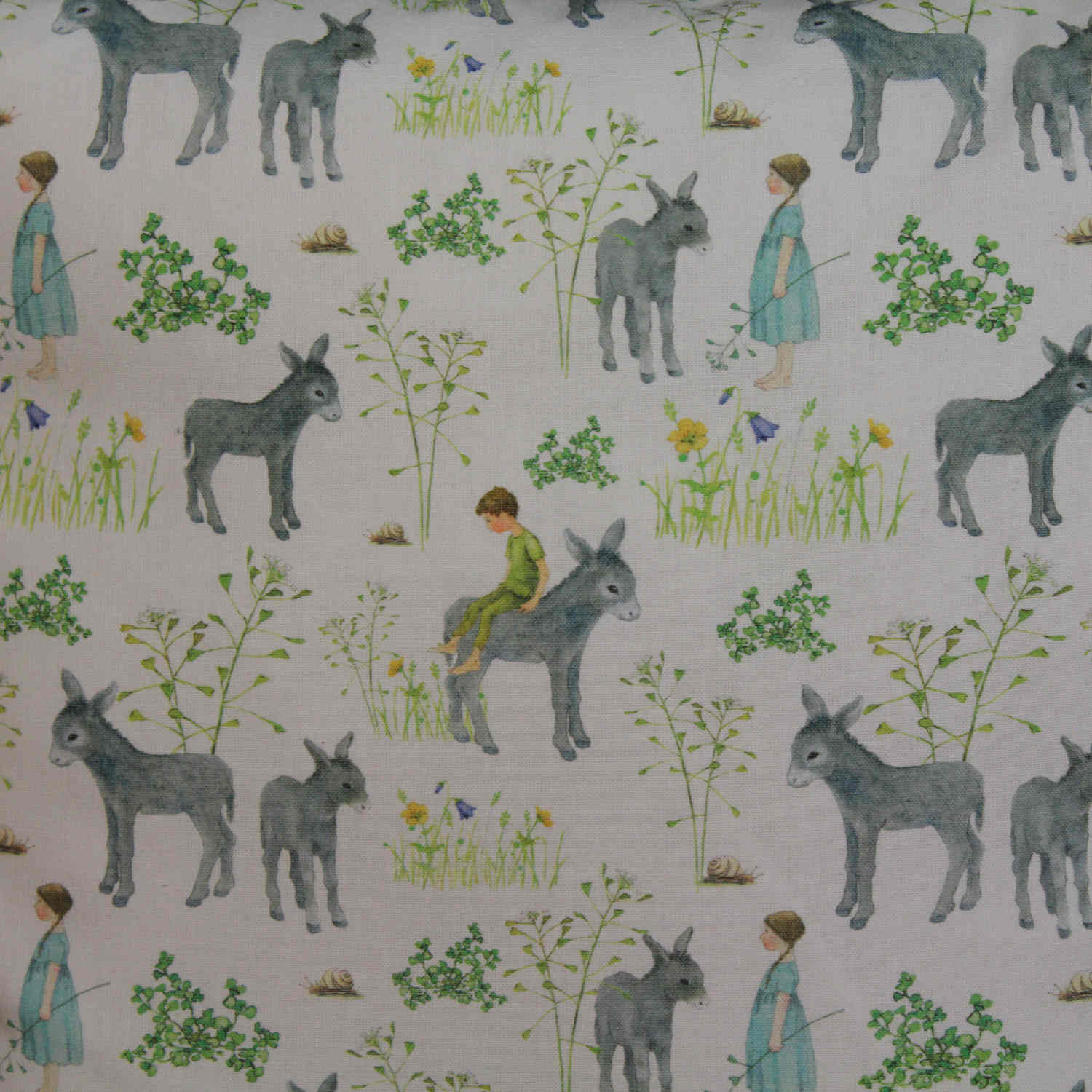 KLeine Esel auf einer Blumenwiese mit spielenden Kindern.