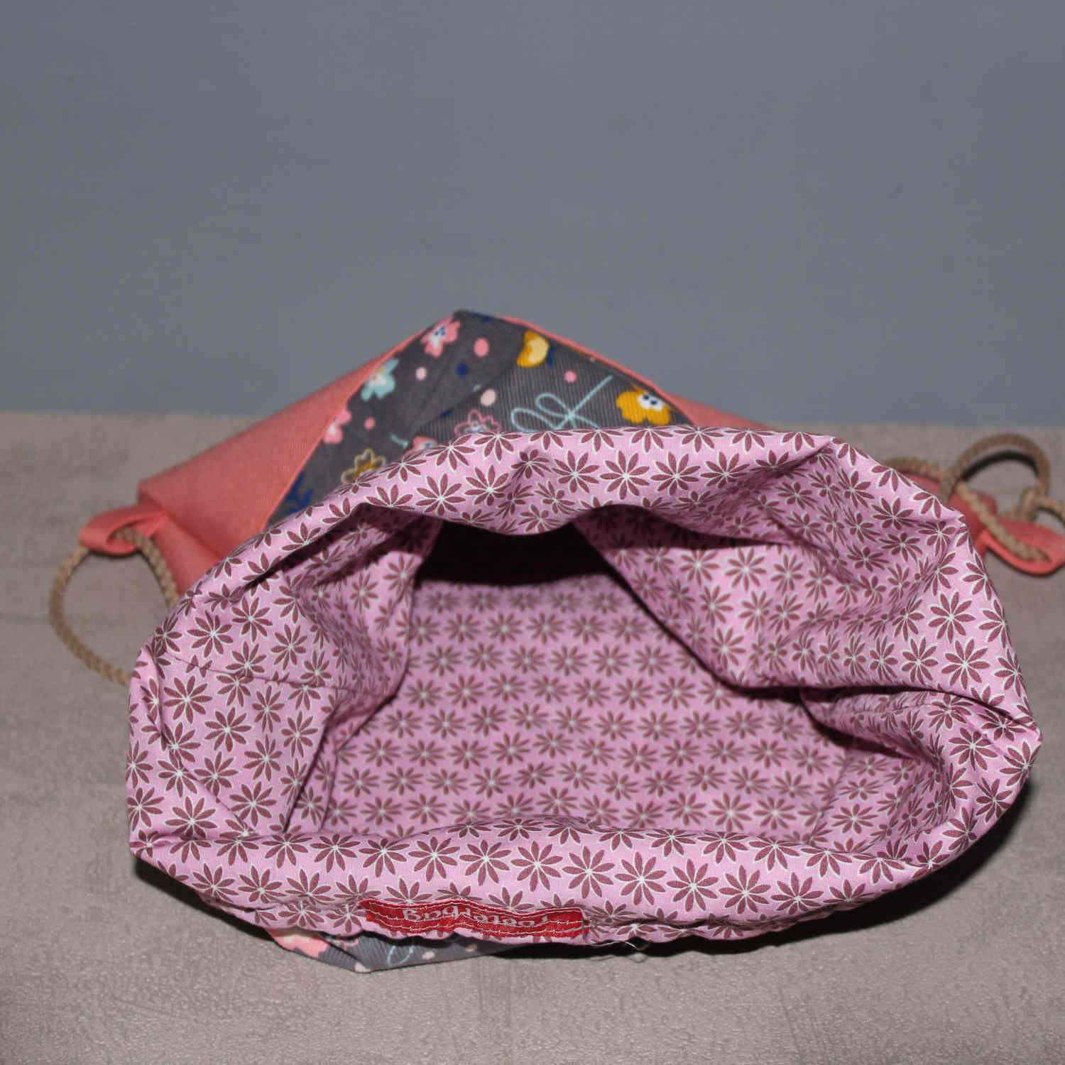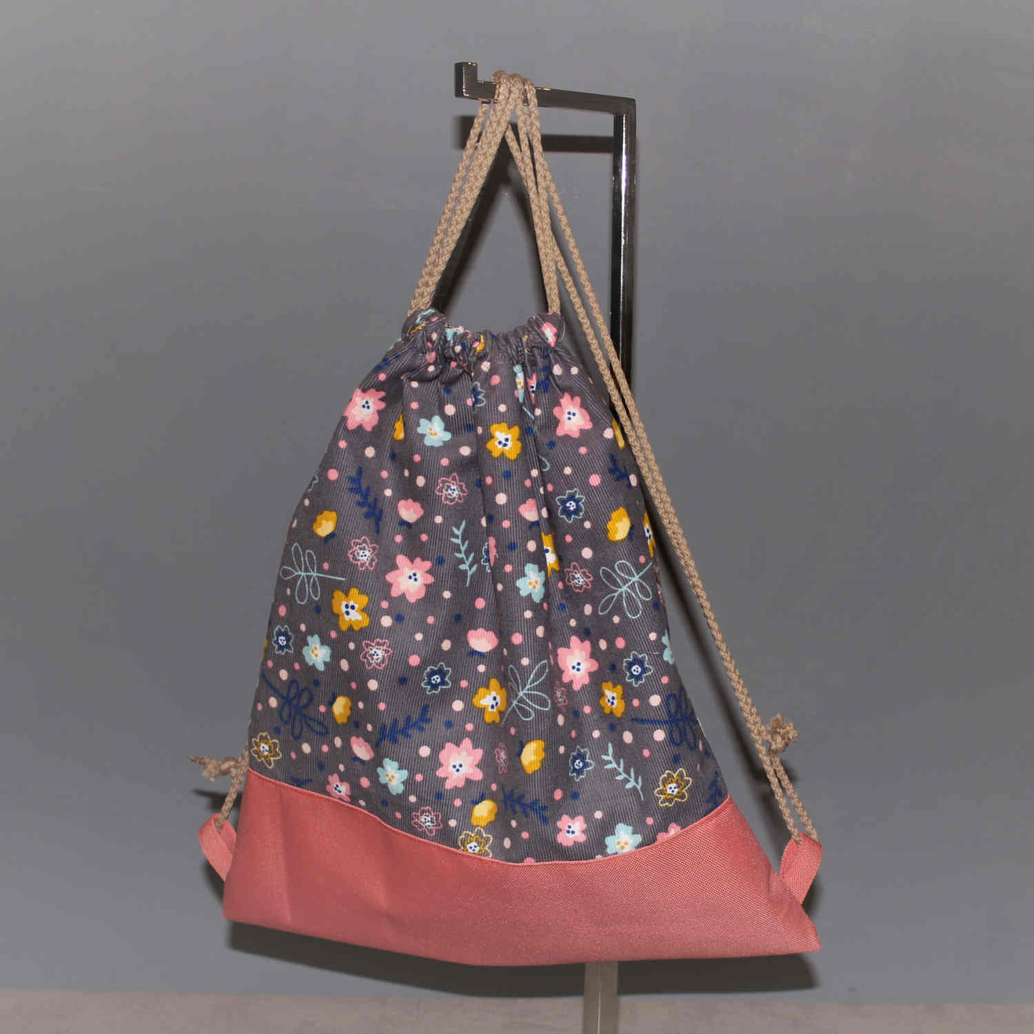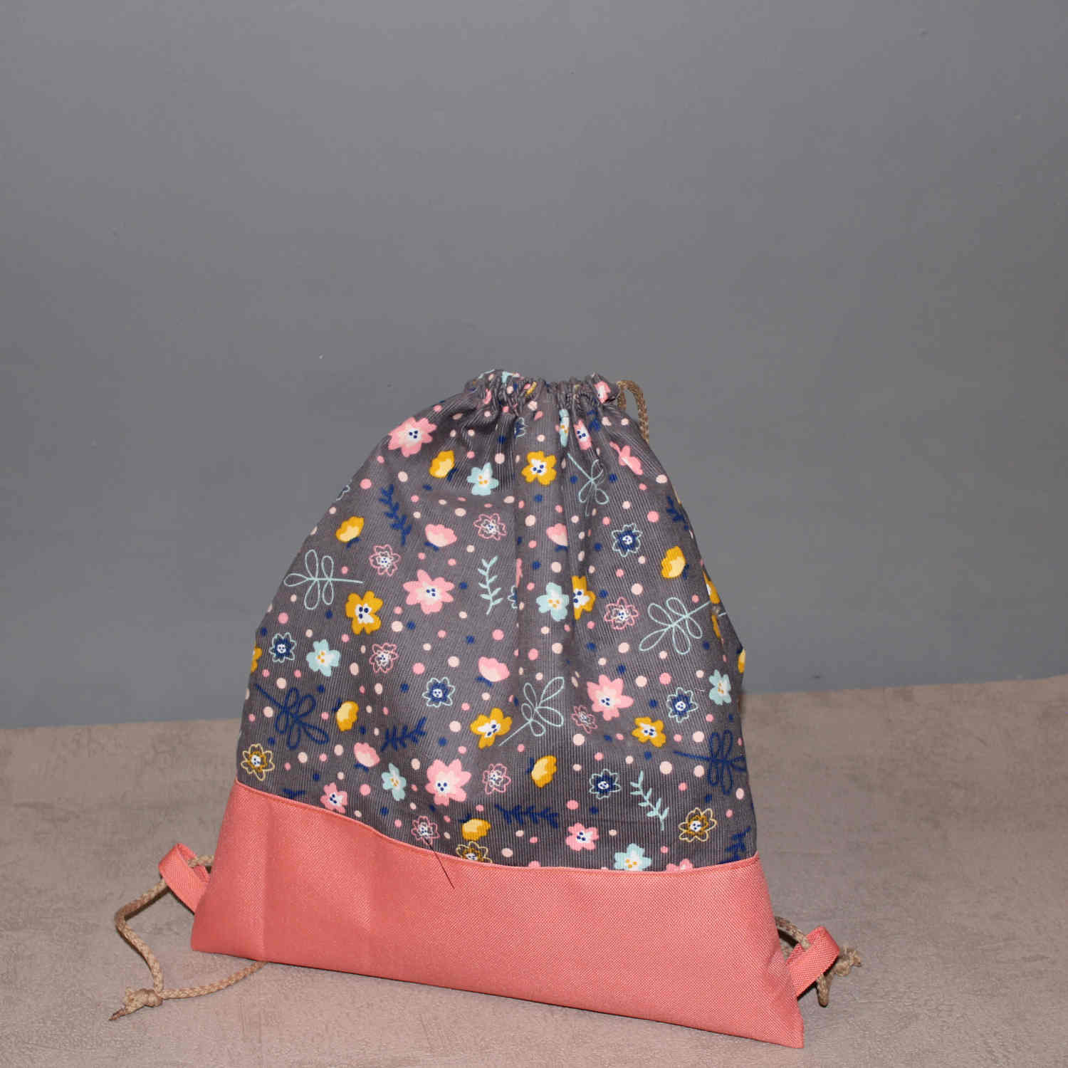 Ein Sportbeutel, oder Rucksack, aus einem blumigen feinen Baumwollcord, abgesetzt mit einem farblich passenden Outdoorstoff. Der Innenbeutel ist aus einem bunten Baumwollstoff genäht.