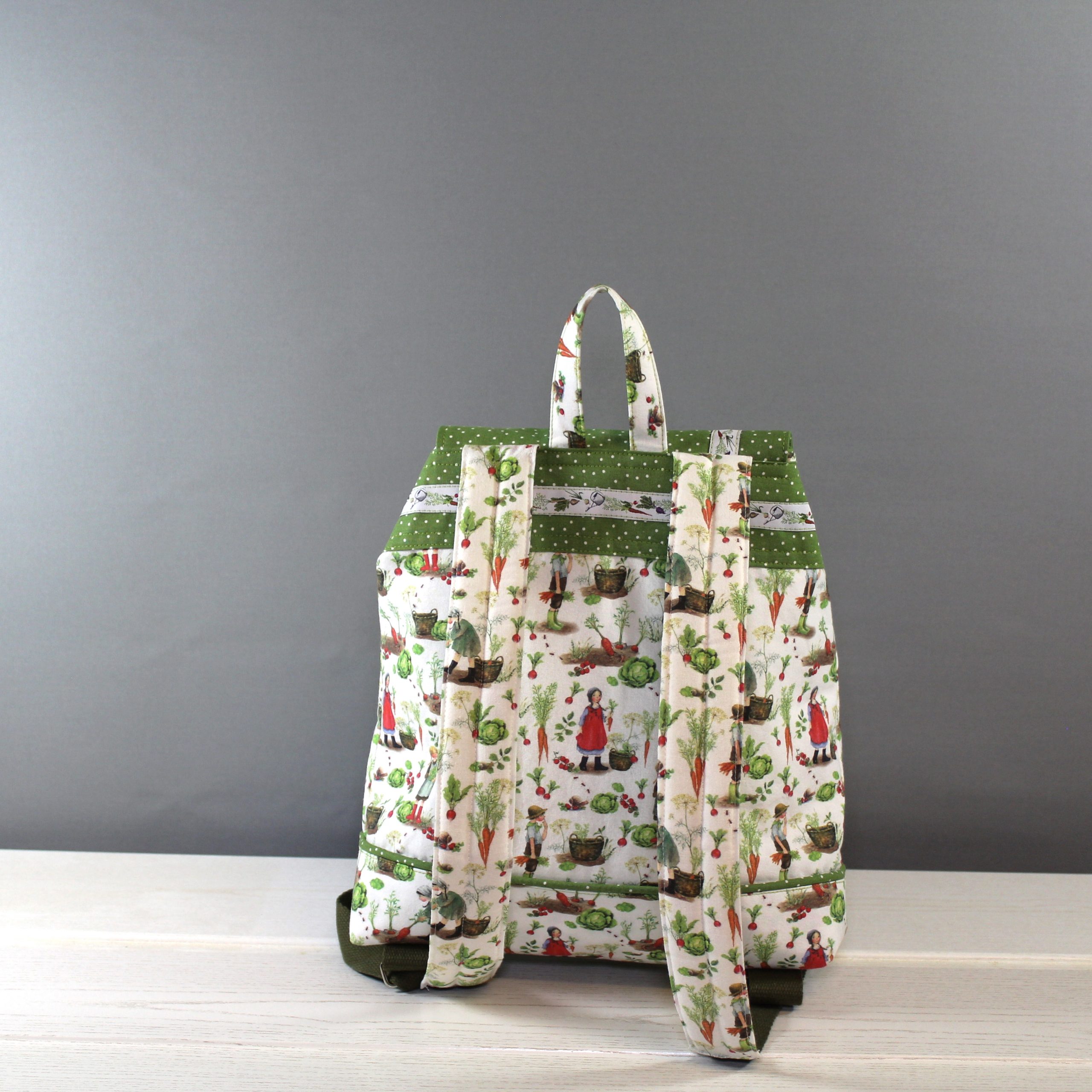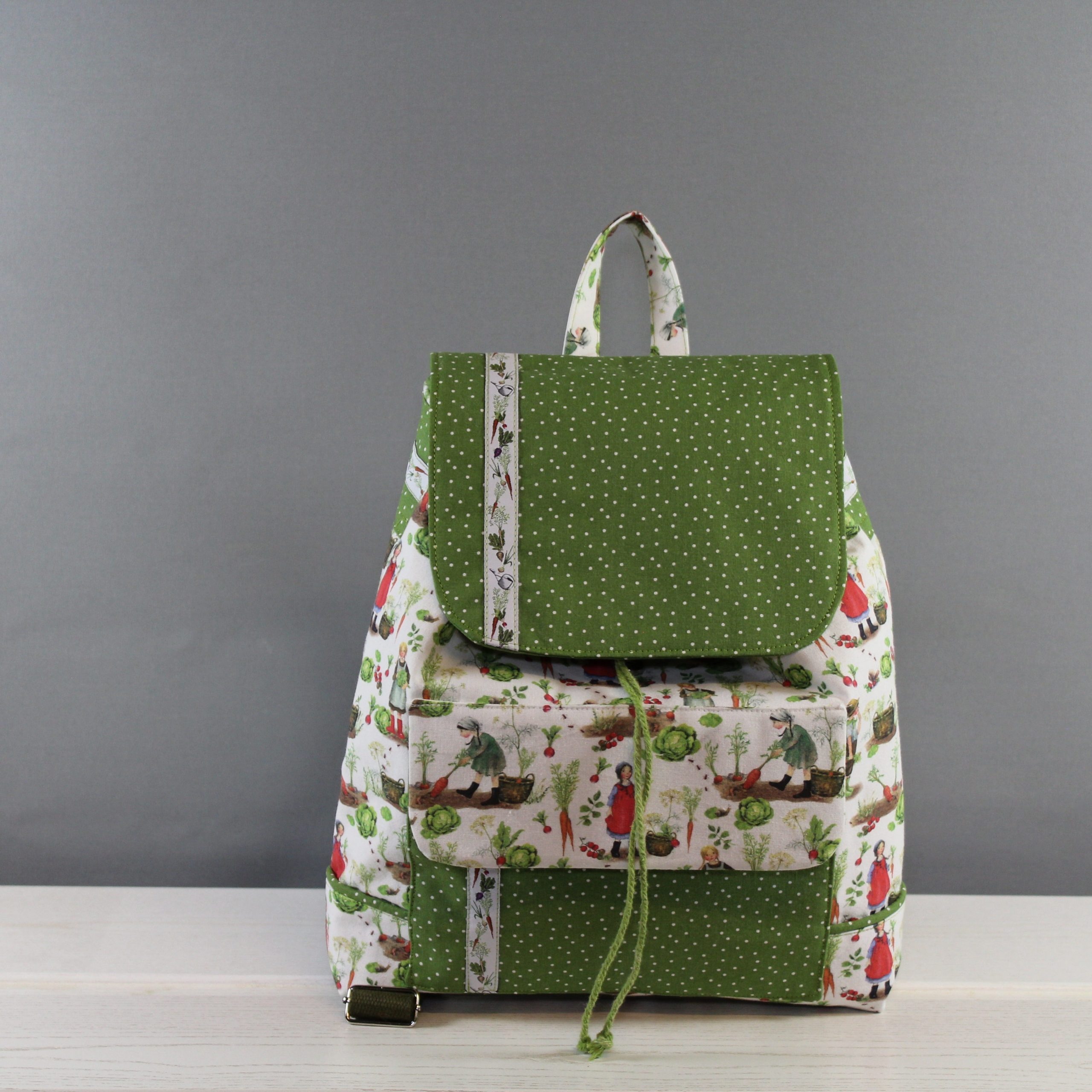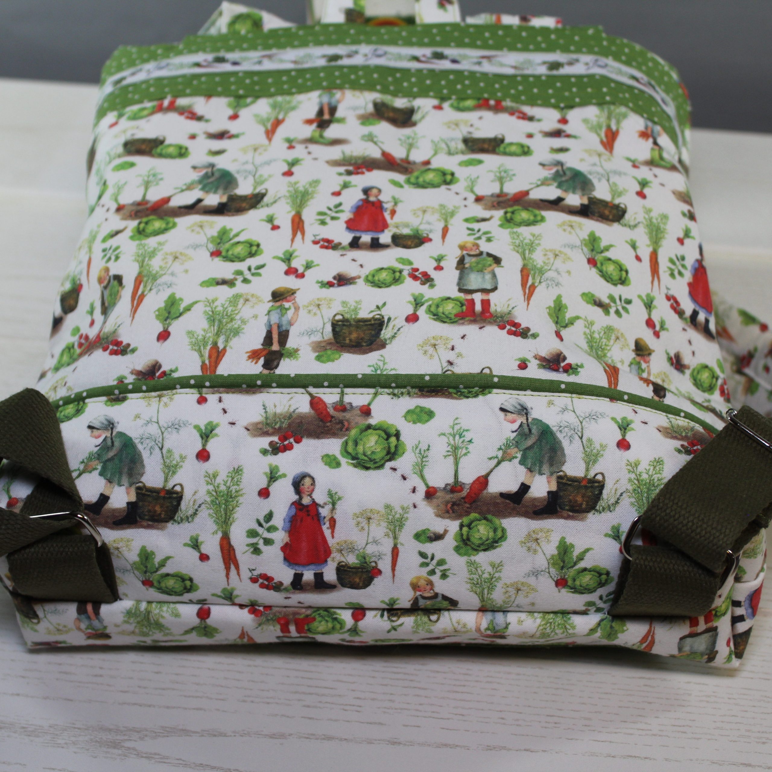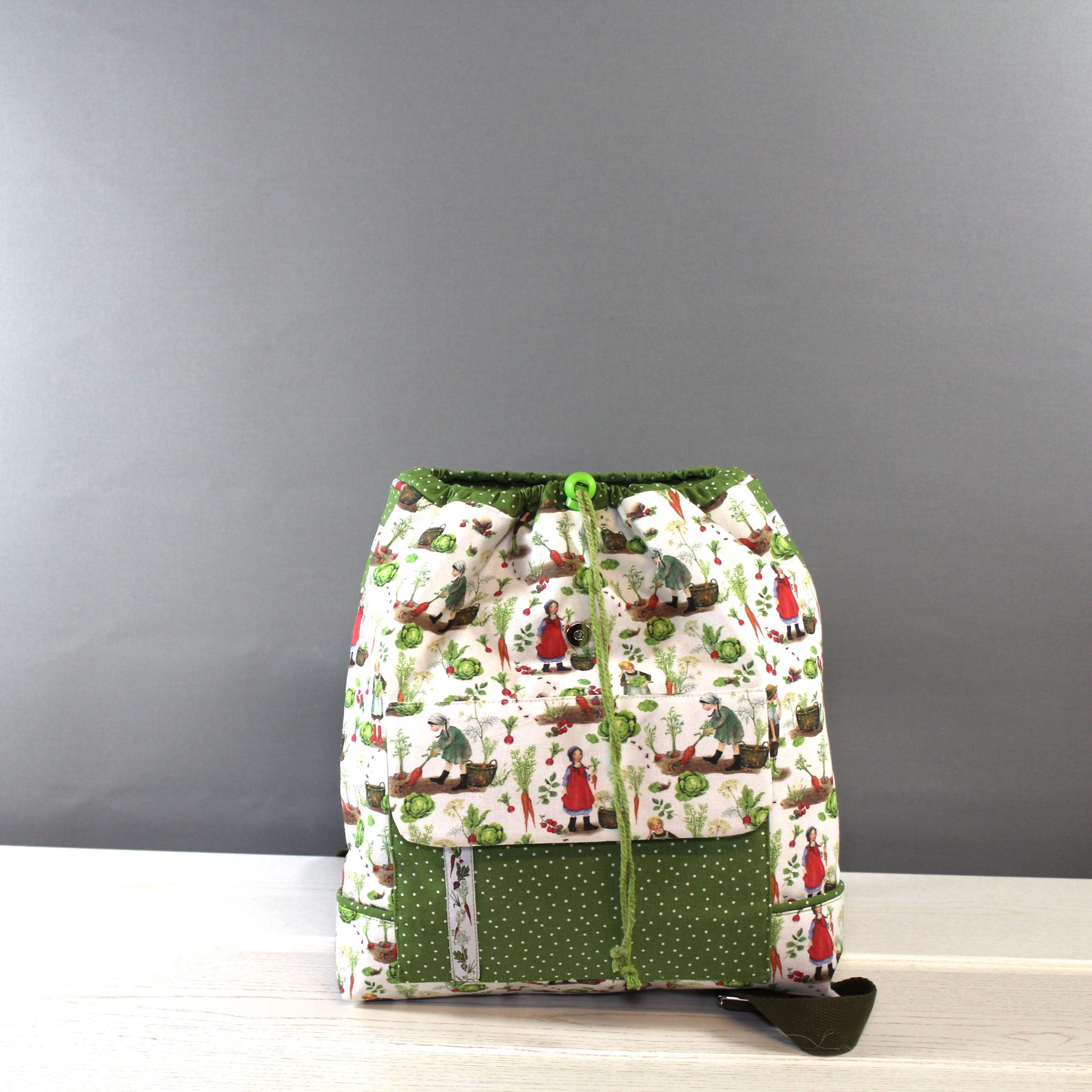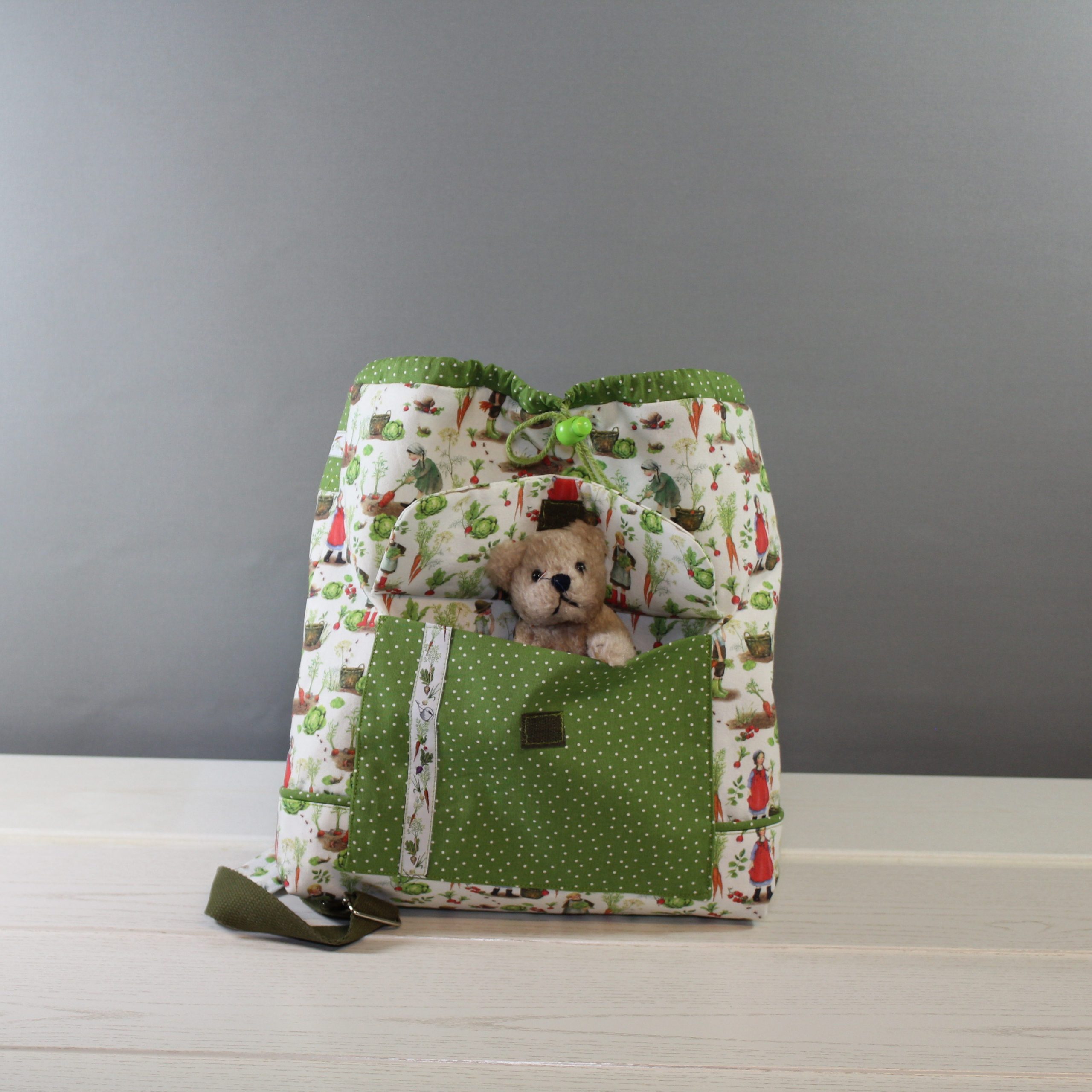 Dieser wunderschöne Rucksack, mit dem tollen Baumwollstoff, ist perfekt für den Kindergarten oder den Familienausflug, hier findet neben einem Kuscheltier auch Essen und Trinken Platz. Die Schultergurte sind gepolstert und abgesteppt und sind bis 75cm variabel. Am Vorderteil sowie im Innenteil befindet sich je eine kleine Tasche. Mit einem Kordeldurchzug und einem Magnetverschluss wird der Rucksack geschlossen. Die kleine Tasche vorne hat unter der Lasche ein Klettverschluss. Ein passendes Schmuckband ist noch ein besonderer Blickpunkt.
