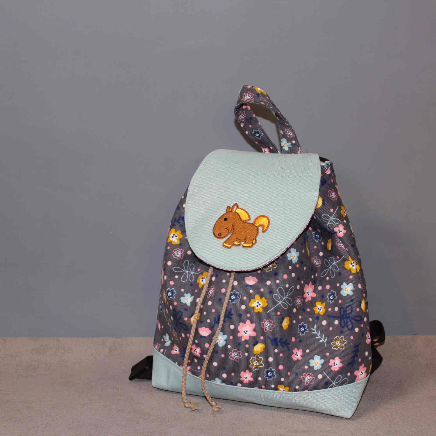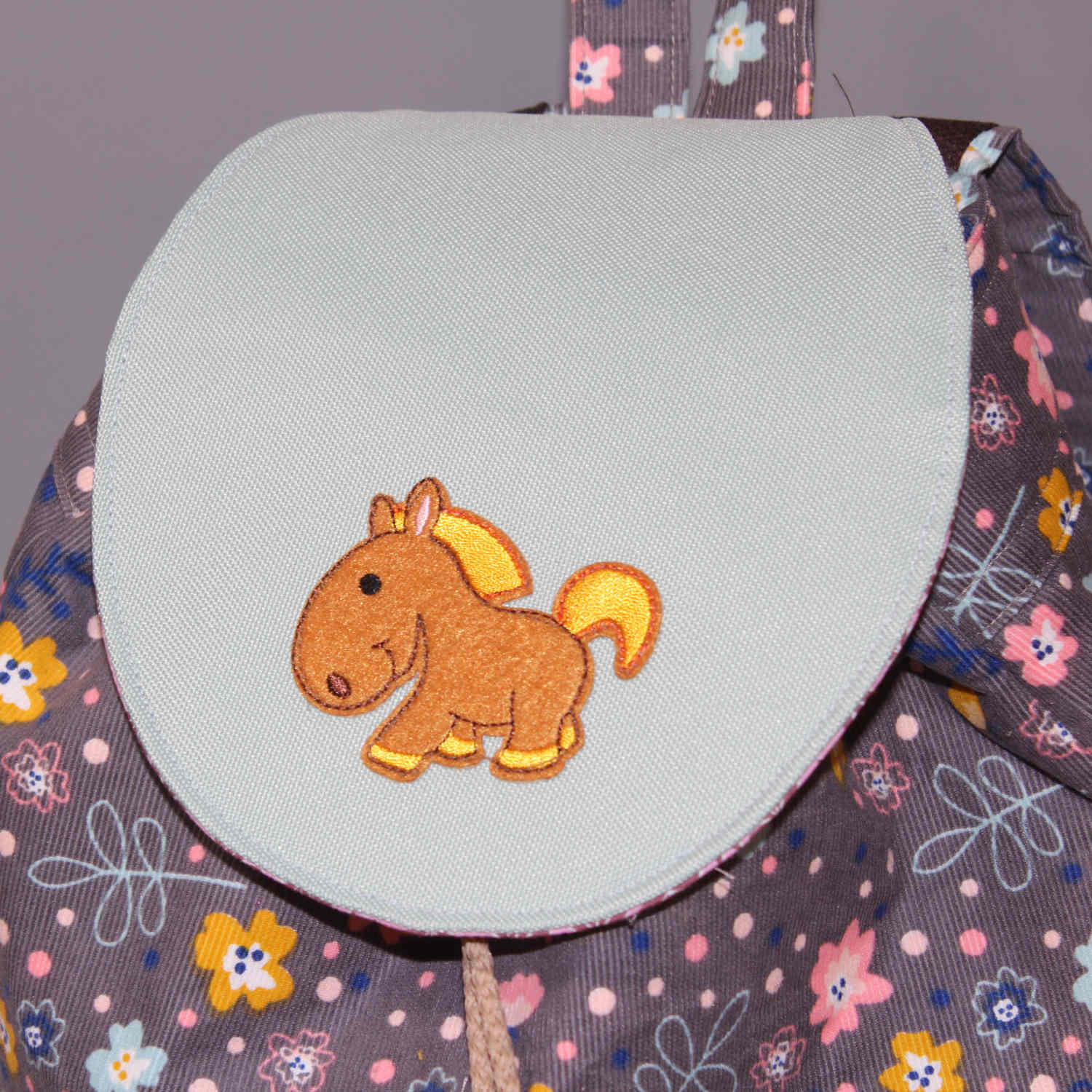 Die Klappe ( auf dem ein Pony aufgenäht wurde) wird mit Klett geschlossen, in einem farbigen Innenfutter befindet sich noch eine kleine Tasche.