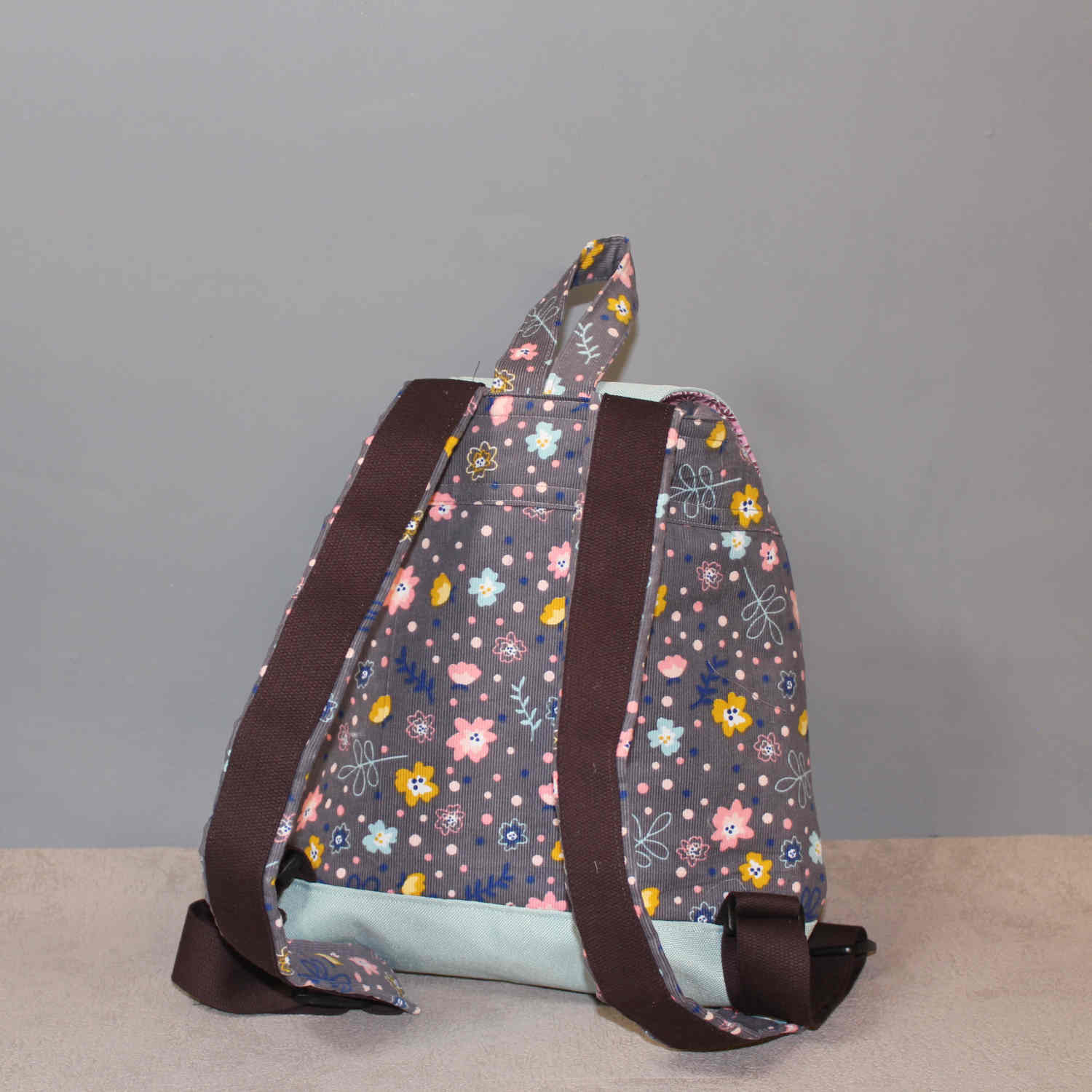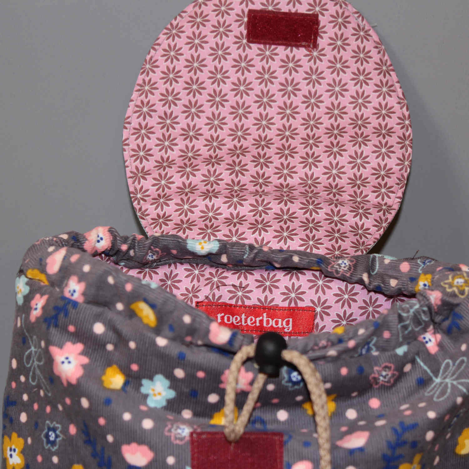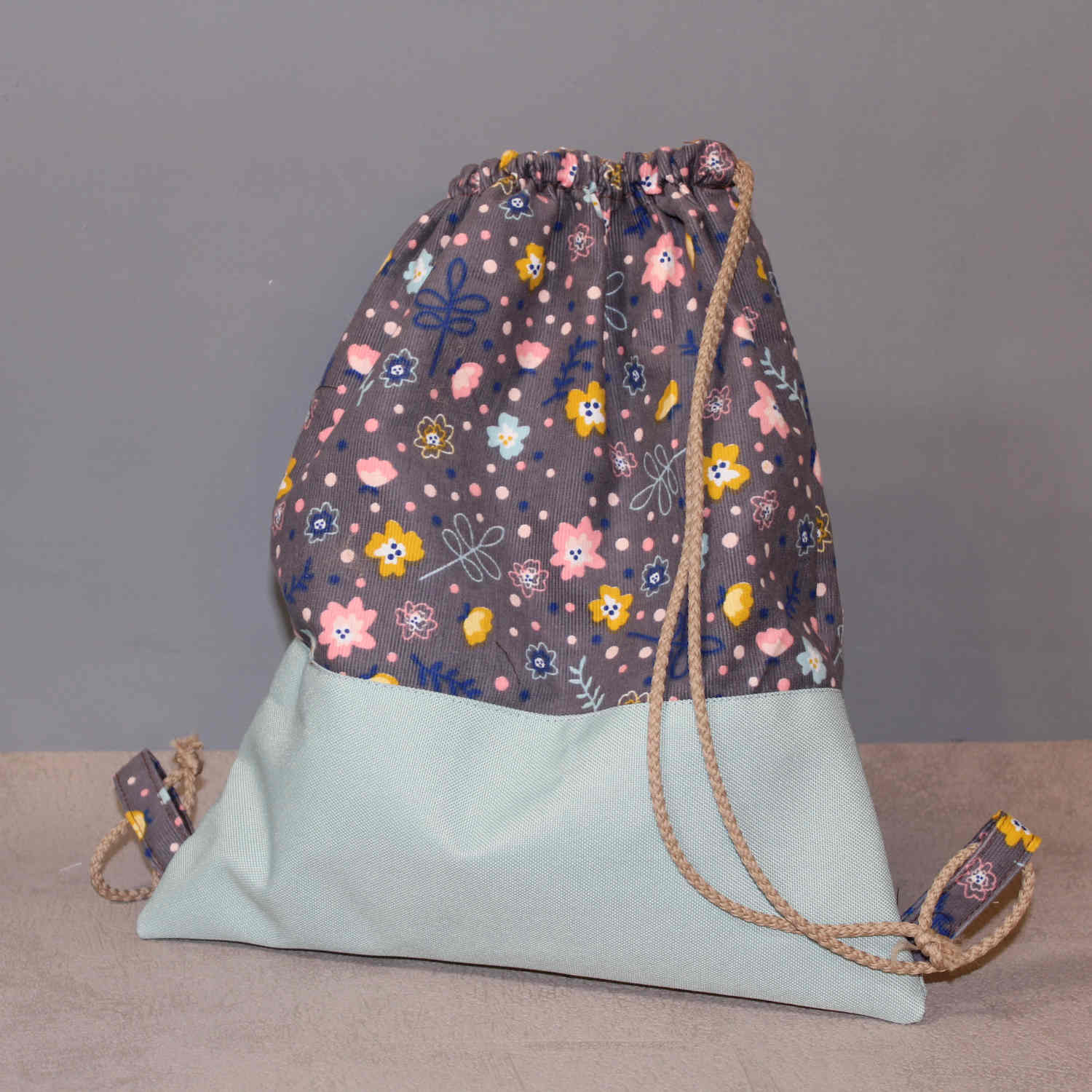 Ein ideales Duo für den Kindergarten, ein Rucksack mit Sportbeutel, aus einem gerippten Blümchenstoff, kombiniert mit einem Outdoor-Stoff in türkis.