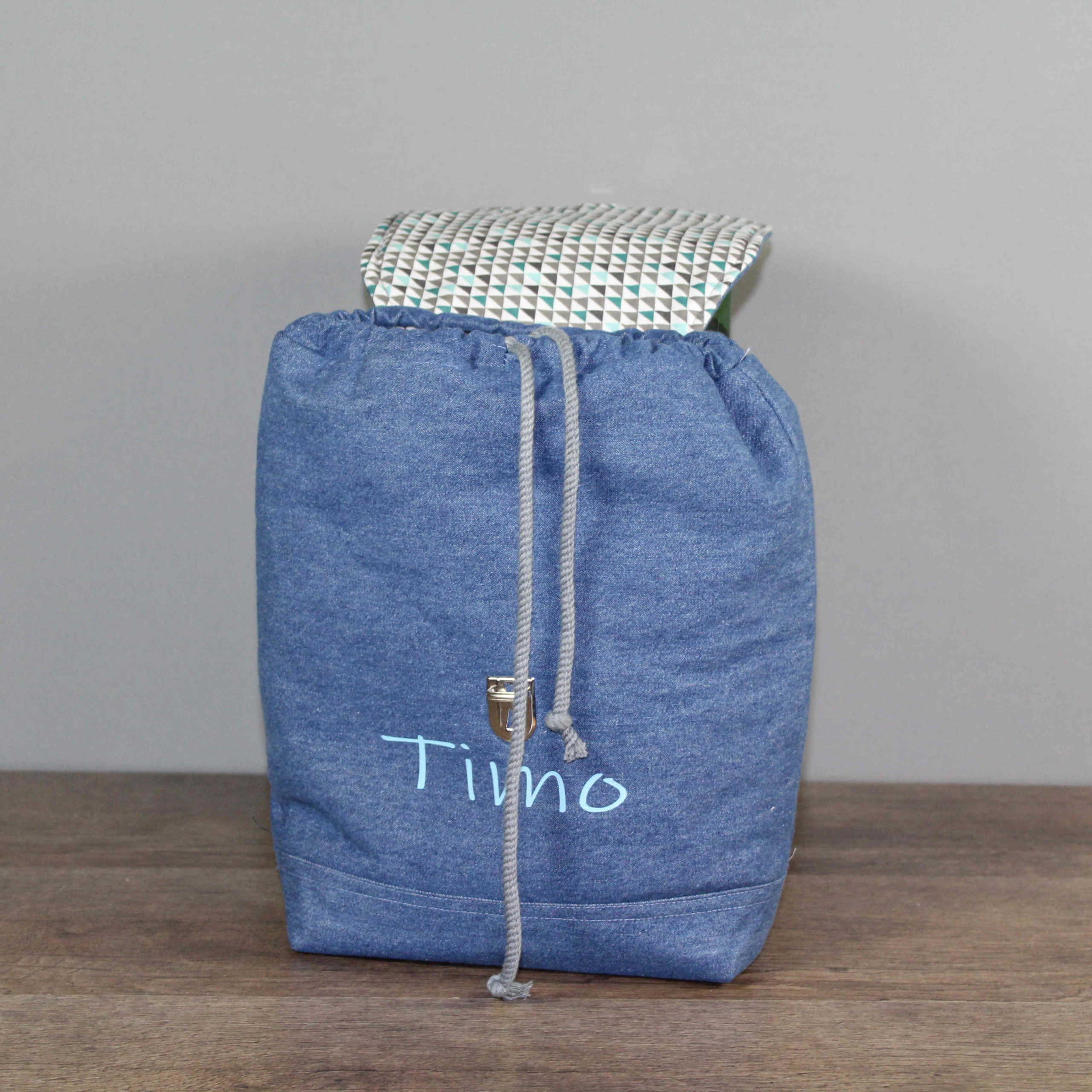 Gearbeitet aus einem blauen Jeansstoff mit Namenszug, der Variabel ist.