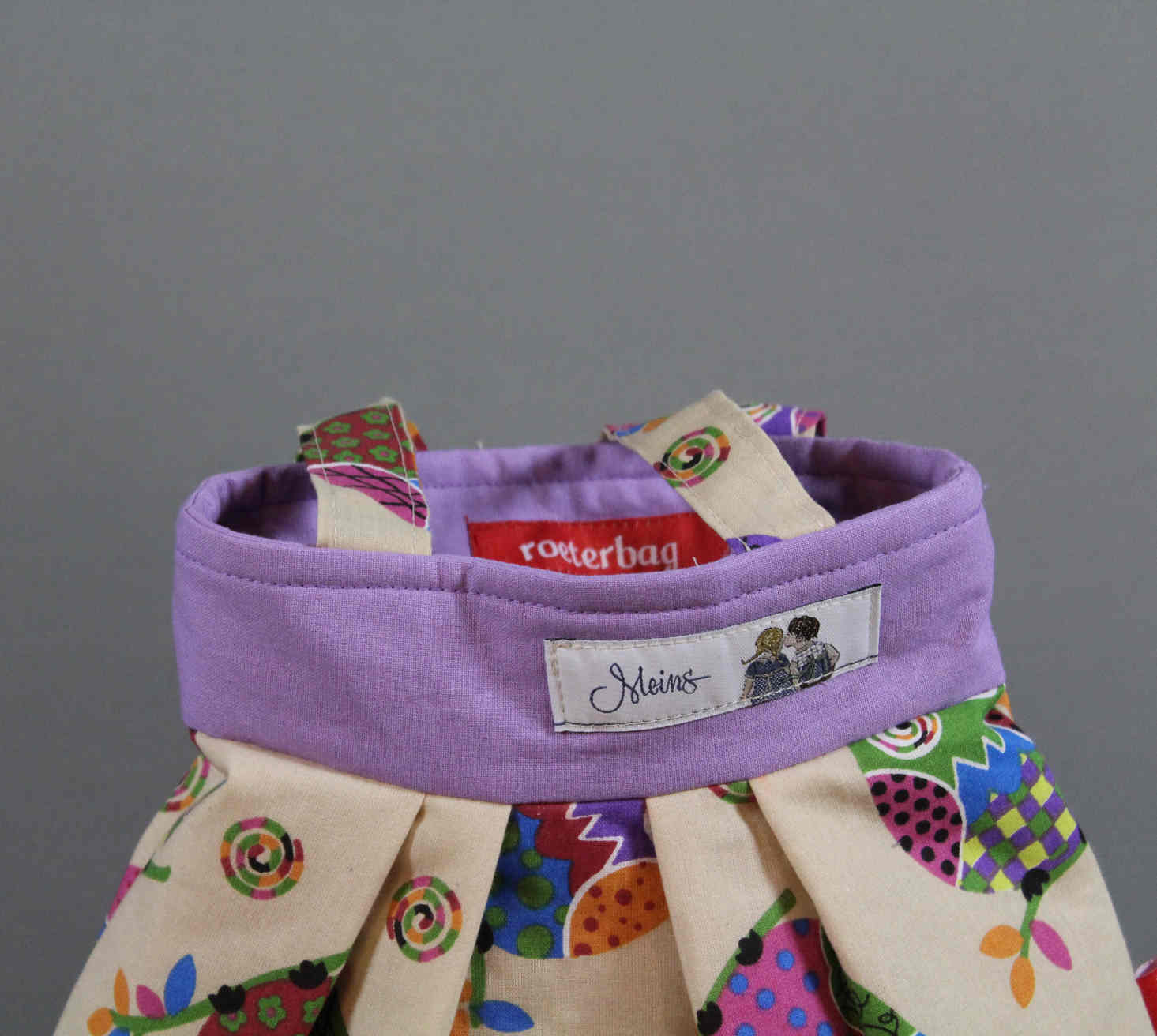 Band mit der Aufschrift „Meins“ ziert den unifarbenen Besats, der das gleiche Material und Farbe hat wie das Futter.
