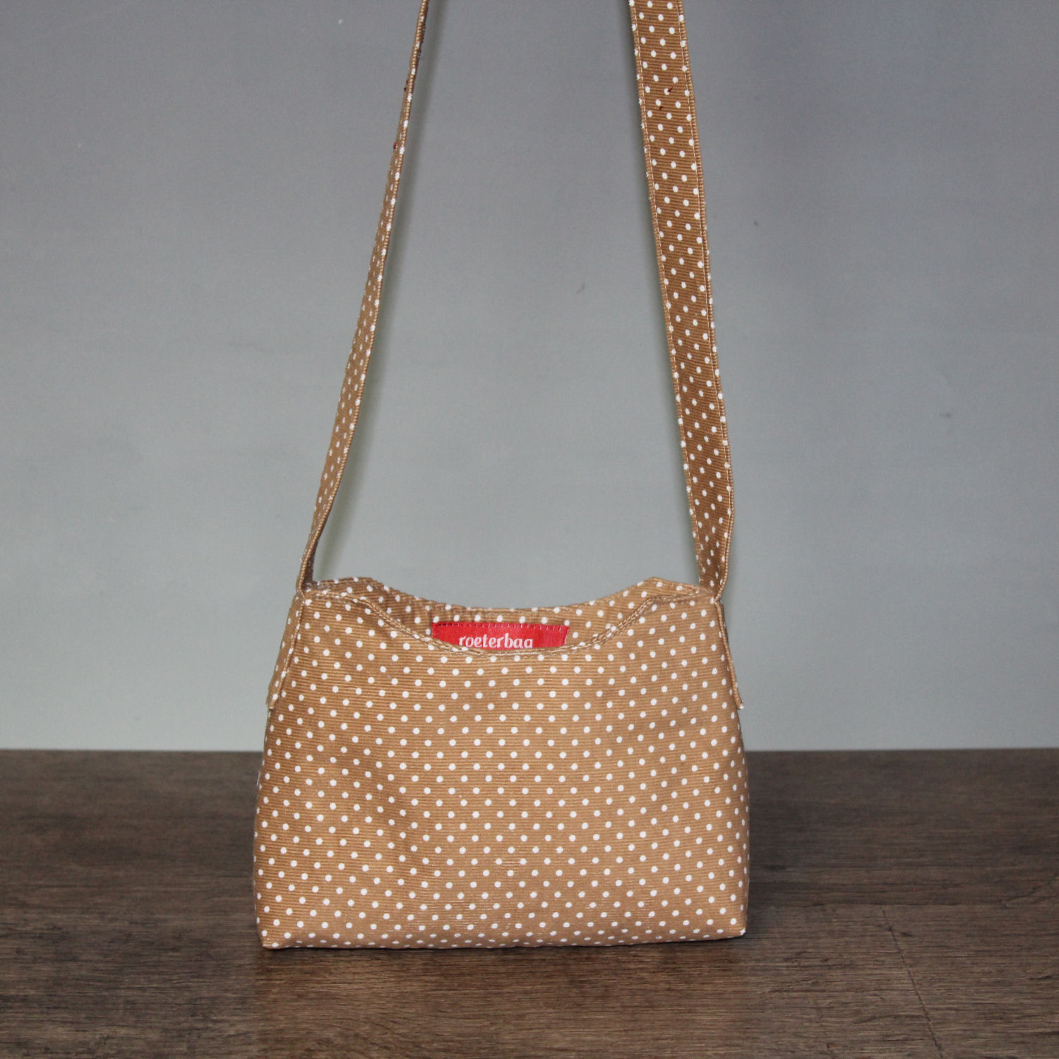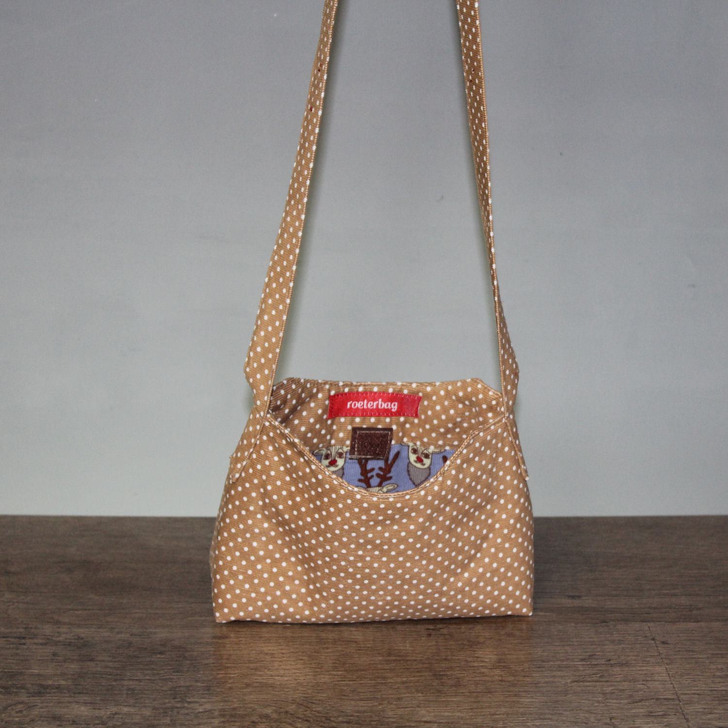 Jule, eine kleine sandfarbene Umhängetasche aus Feincord mit kleinen hellen Punkten. Sie hat ein lustiges Futter mit Elchköpfen und zum Schließen ein Klettband.