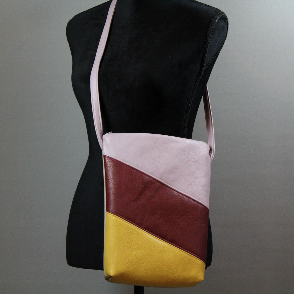 Eine Kombination schöner Farben (Gelb, Weinrot und ein helles Lila) befinden sich auf dieser Tasche. Die Rückseite ist in dunkelbeige.