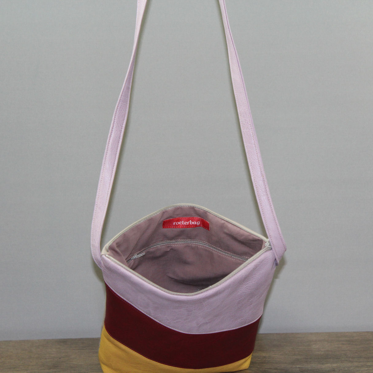 Im Innenfutter aus Baumwolle befindet sich eine Reißverschlusstasche. Da das Kunstleder sehr weich ist, wurde die Tasche mit Vlies verstärkt.