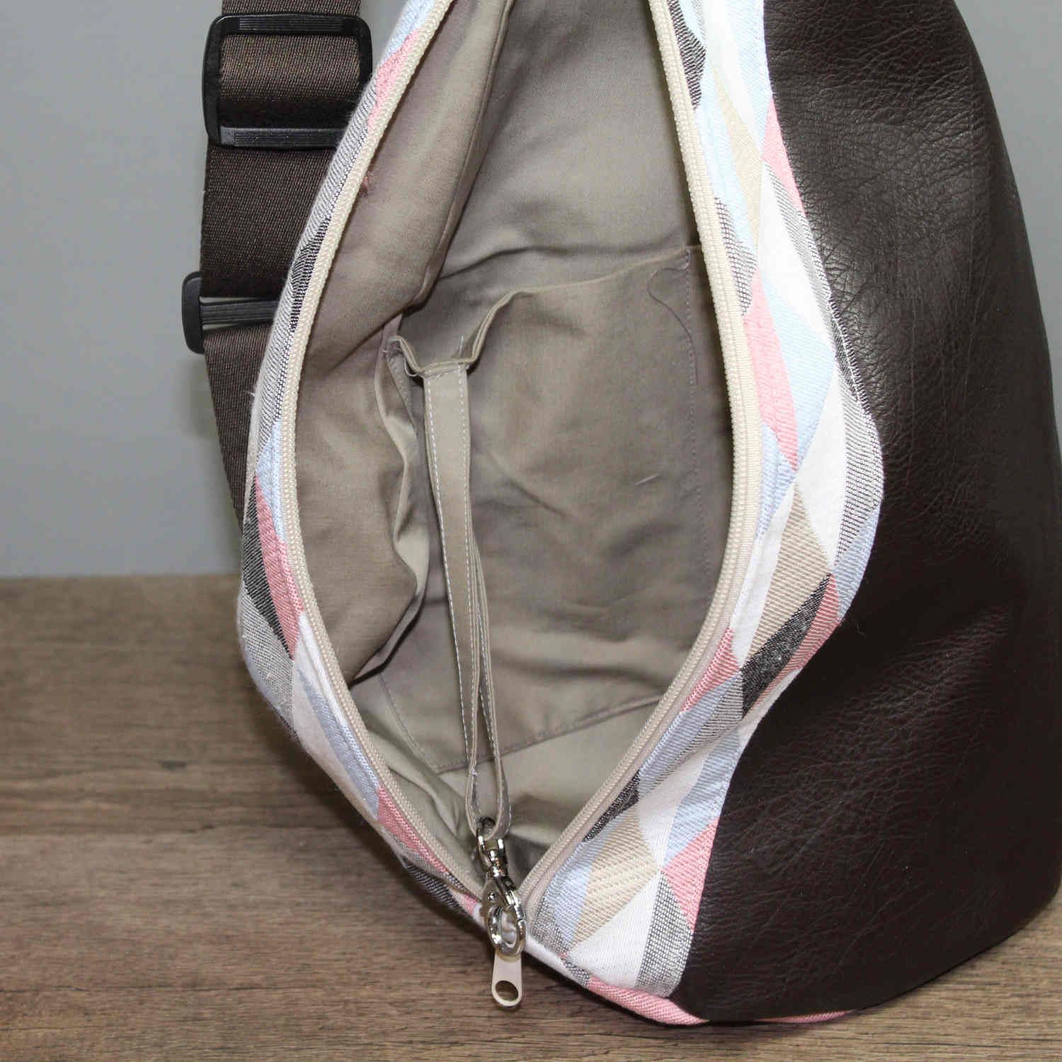 In dem Baumwollfutter befinden sich zwei Steckfächer, hier ist zusätzlich ein Karabinerhaken angebracht für den Schlüssel und ein Reißverschlussfach.