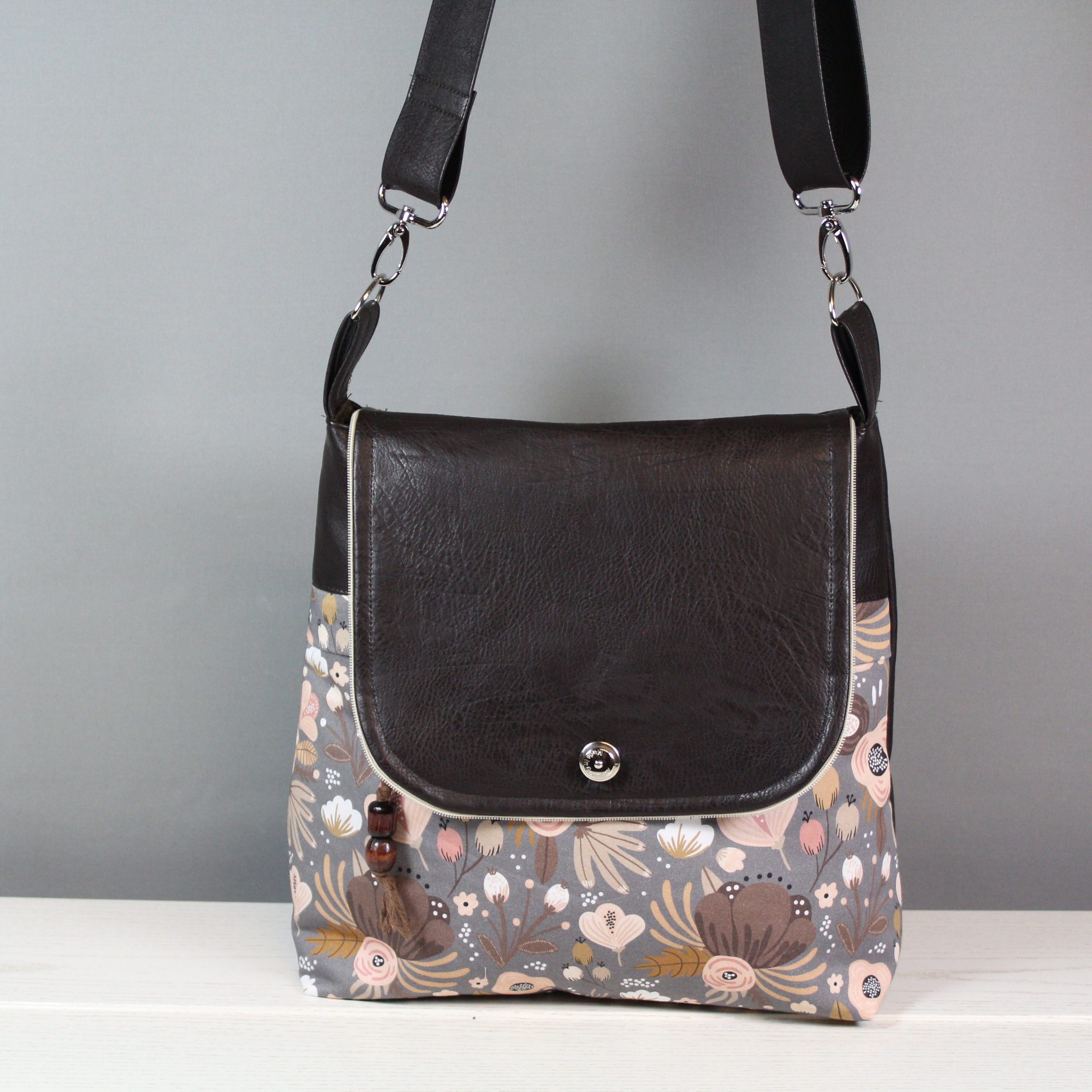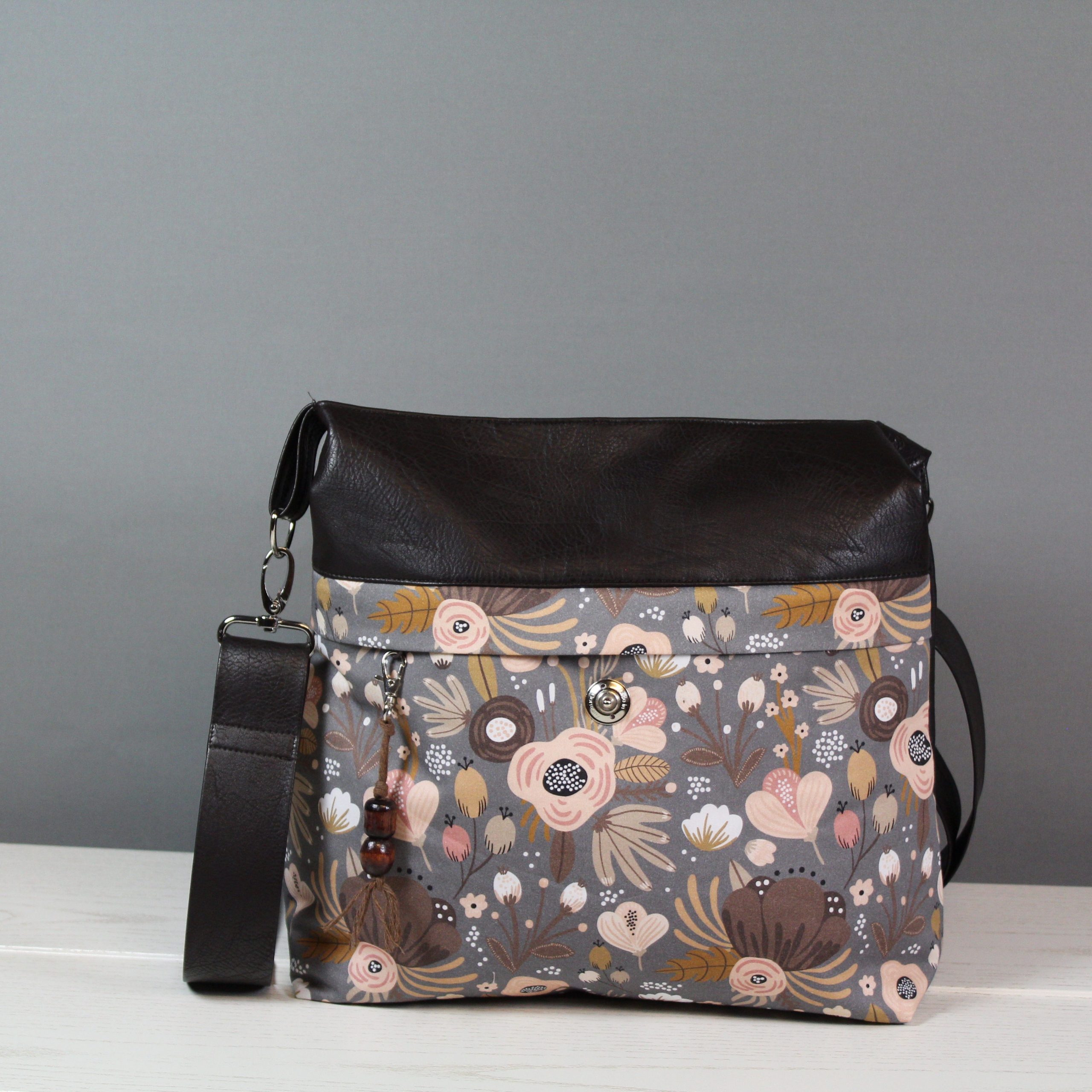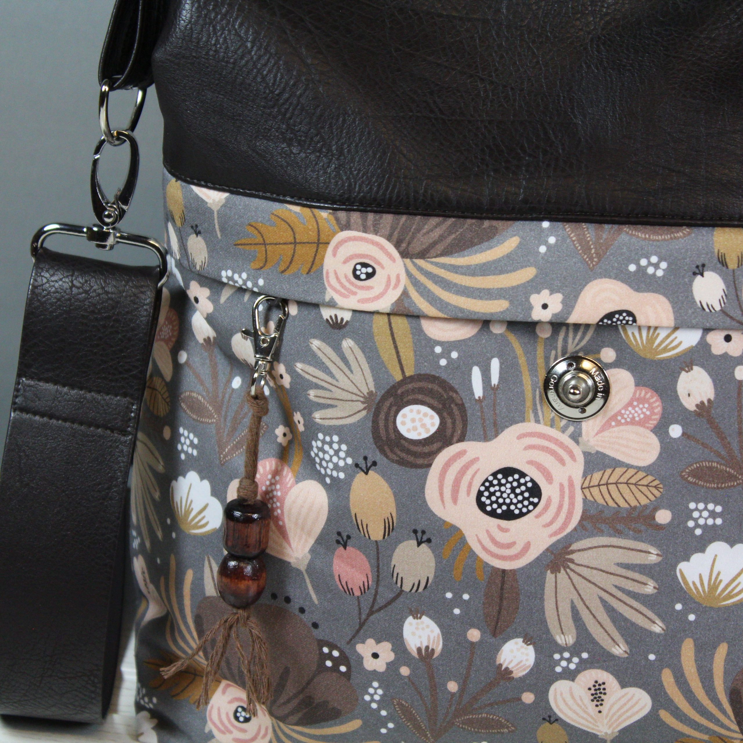 Diese Tasche hat eine farblich perfekte Kombination. Das Material ist ein braunes Kunstleder mit einem blumigen Baumwollstoff. Diverse Fächer im Inneren sorgen für Ordnung, sowie ein Karabinerhaken für den Schlüssel. Ein weiteres Reißverschlussfach befindet sich in Front der Tasche unter dem kleinen Umschlag, hier ist eine kleine Hilfe zum Öffnen angebracht. Ein Steckschloss schließt die Tasche. Verstärgt wurde die Tasche mit Volumenvlies.
