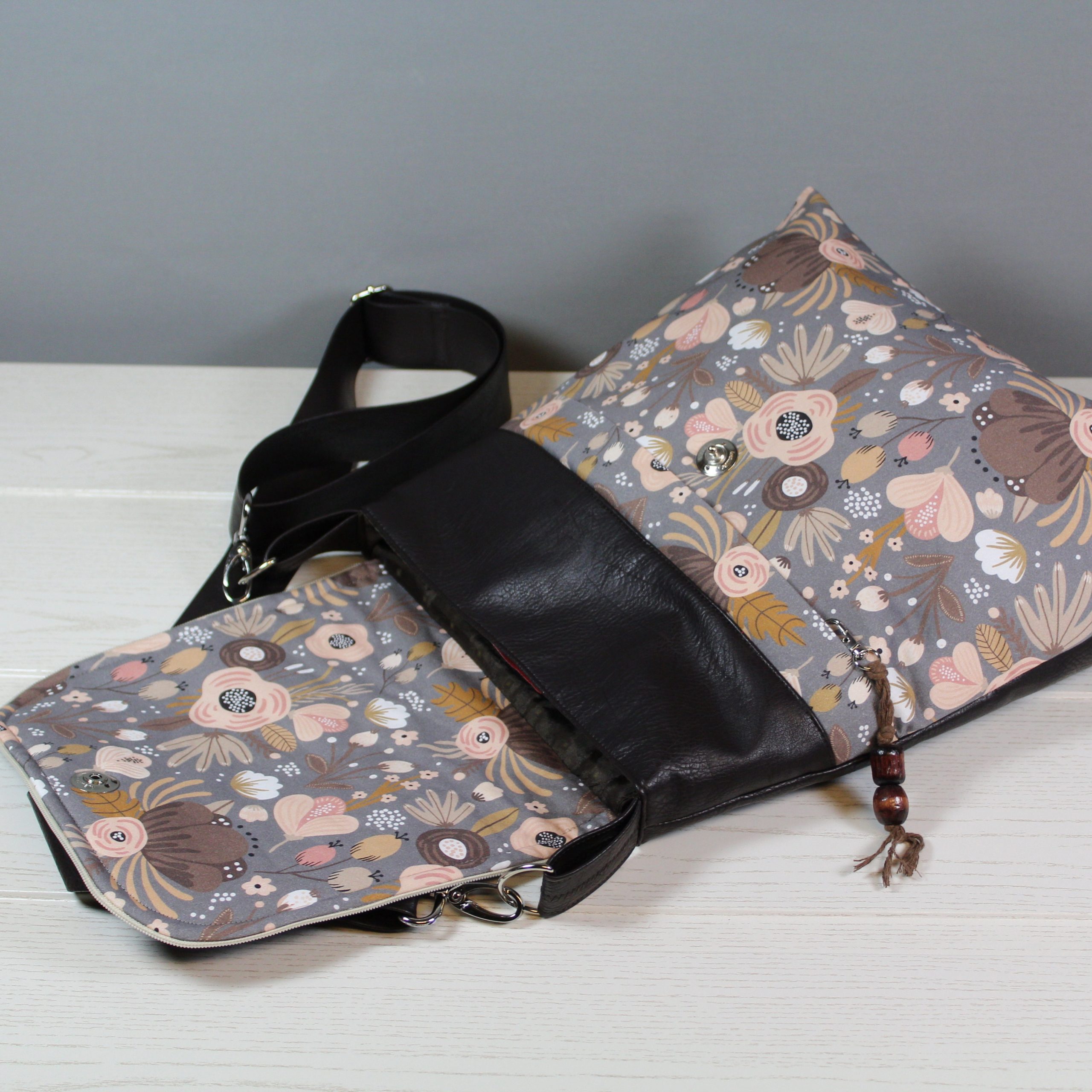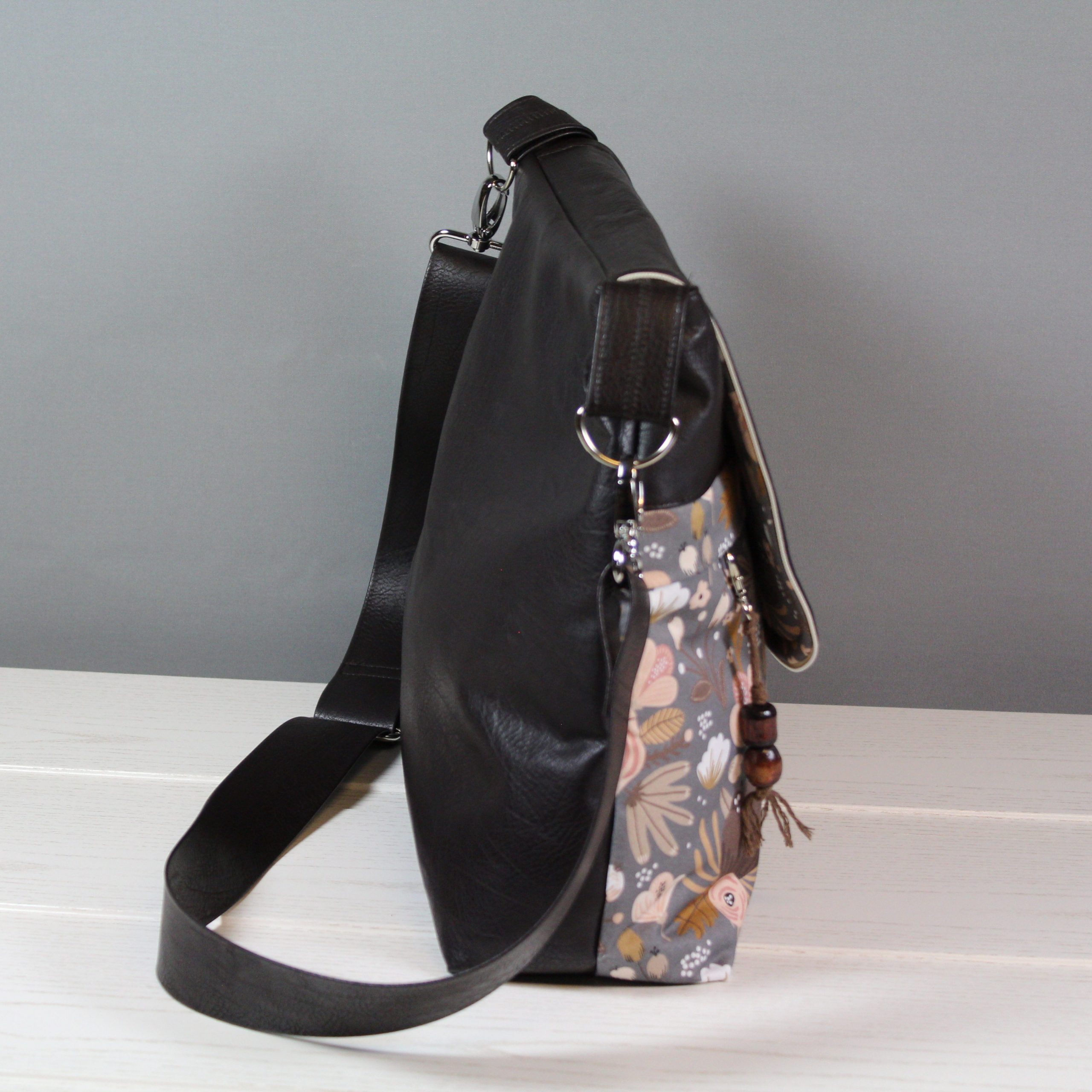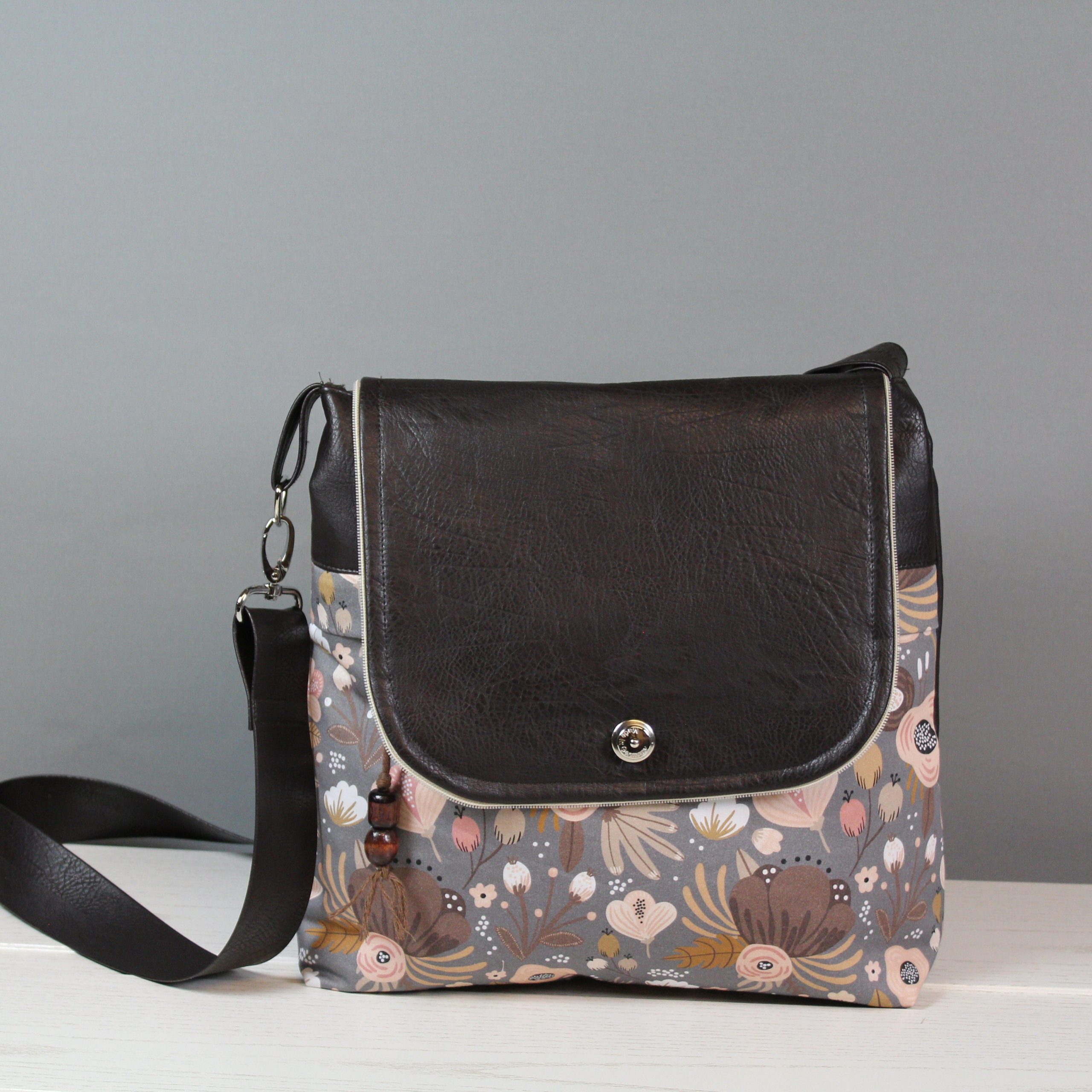 Diese Tasche hat eine farblich perfekte Kombination. Das Material ist ein braunes Kunstleder mit einem blumigen Baumwollstoff. Diverse Fächer im Inneren sorgen für Ordnung, sowie ein Karabinerhaken für den Schlüssel. Ein weiteres Reißverschlussfach befindet sich in Front der Tasche unter dem kleinen Umschlag, hier ist eine kleine Hilfe zum Öffnen angebracht. Ein Steckschloss schließt die Tasche. Verstärgt wurde die Tasche mit Volumenvlies.