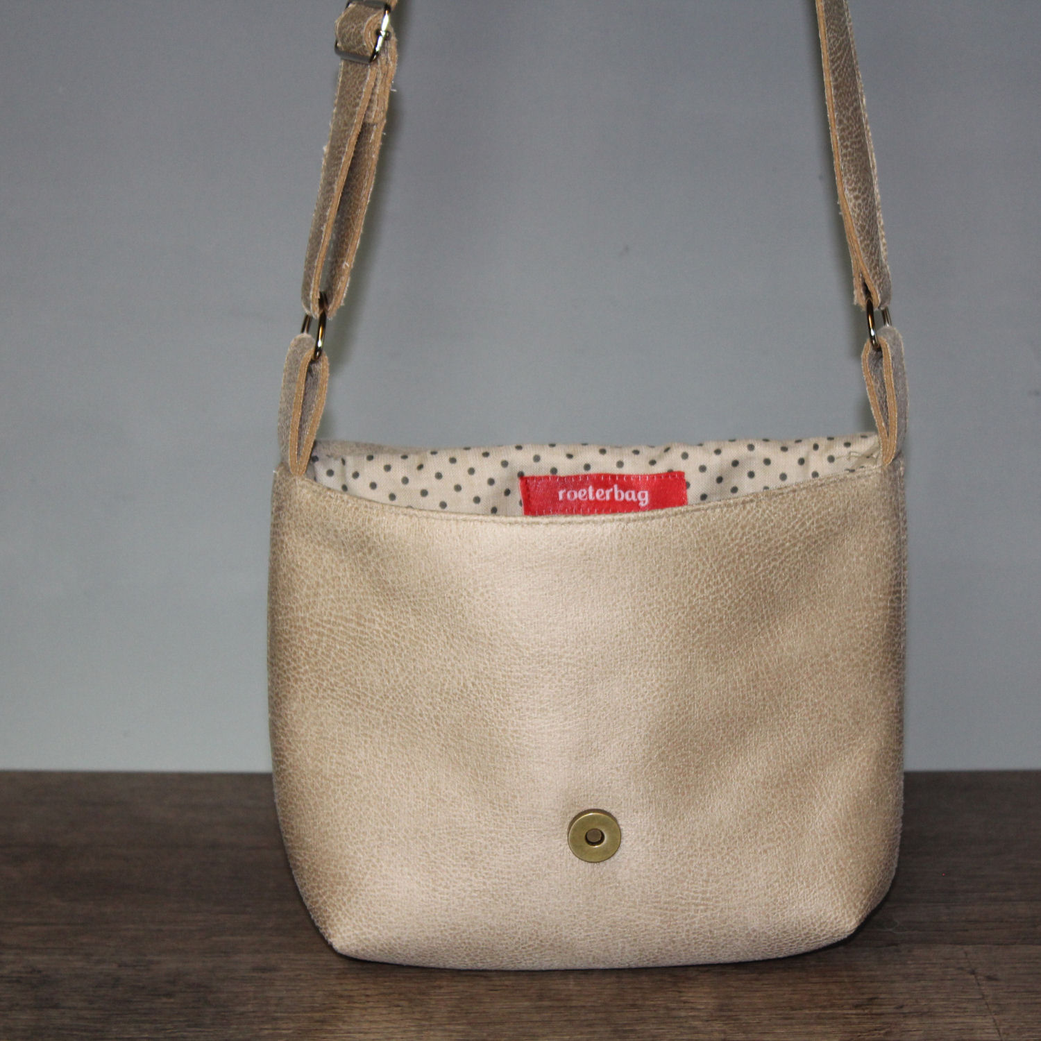 Eine messingfarbene Niete verdeckt den Magnetknopf, der als Verschluss dient.
