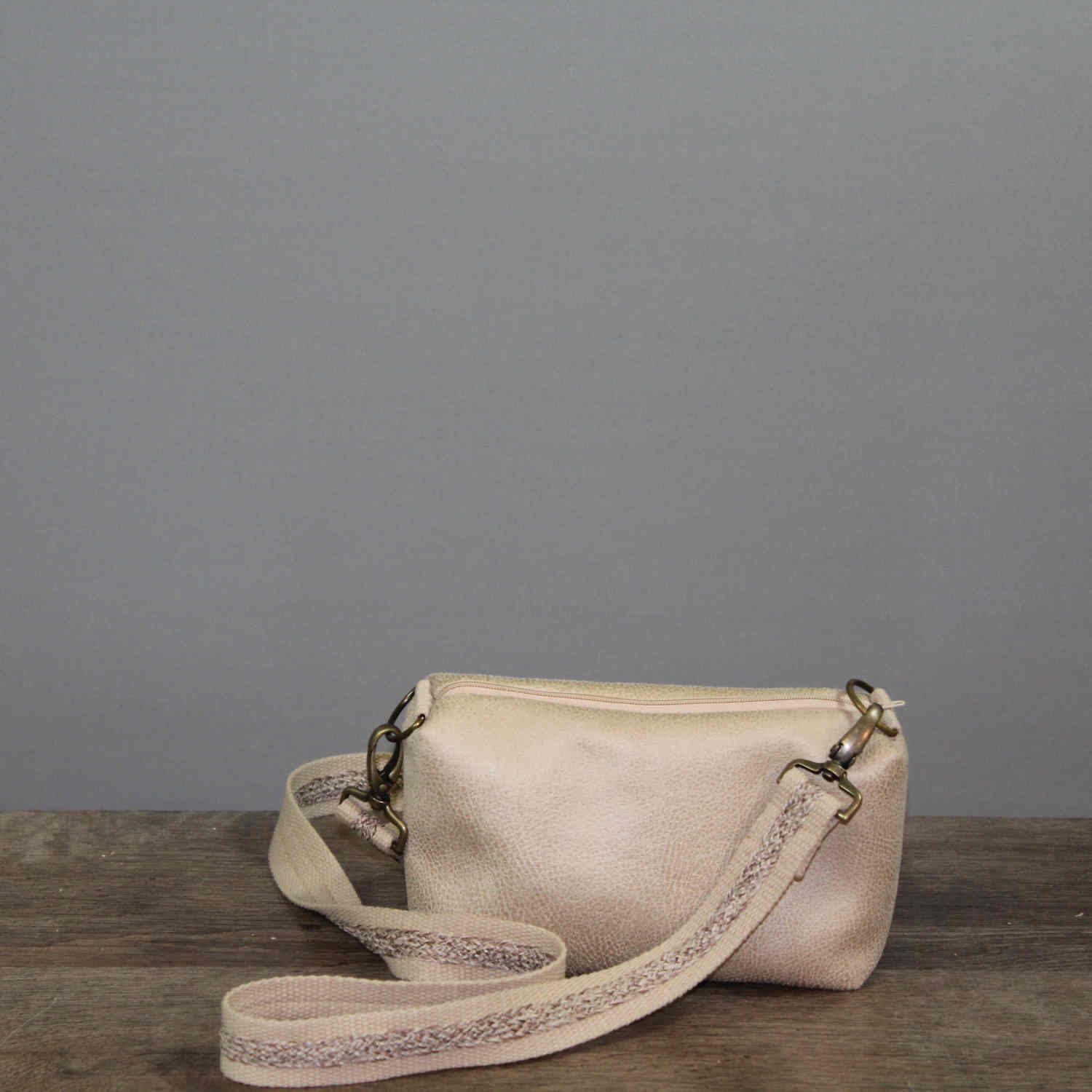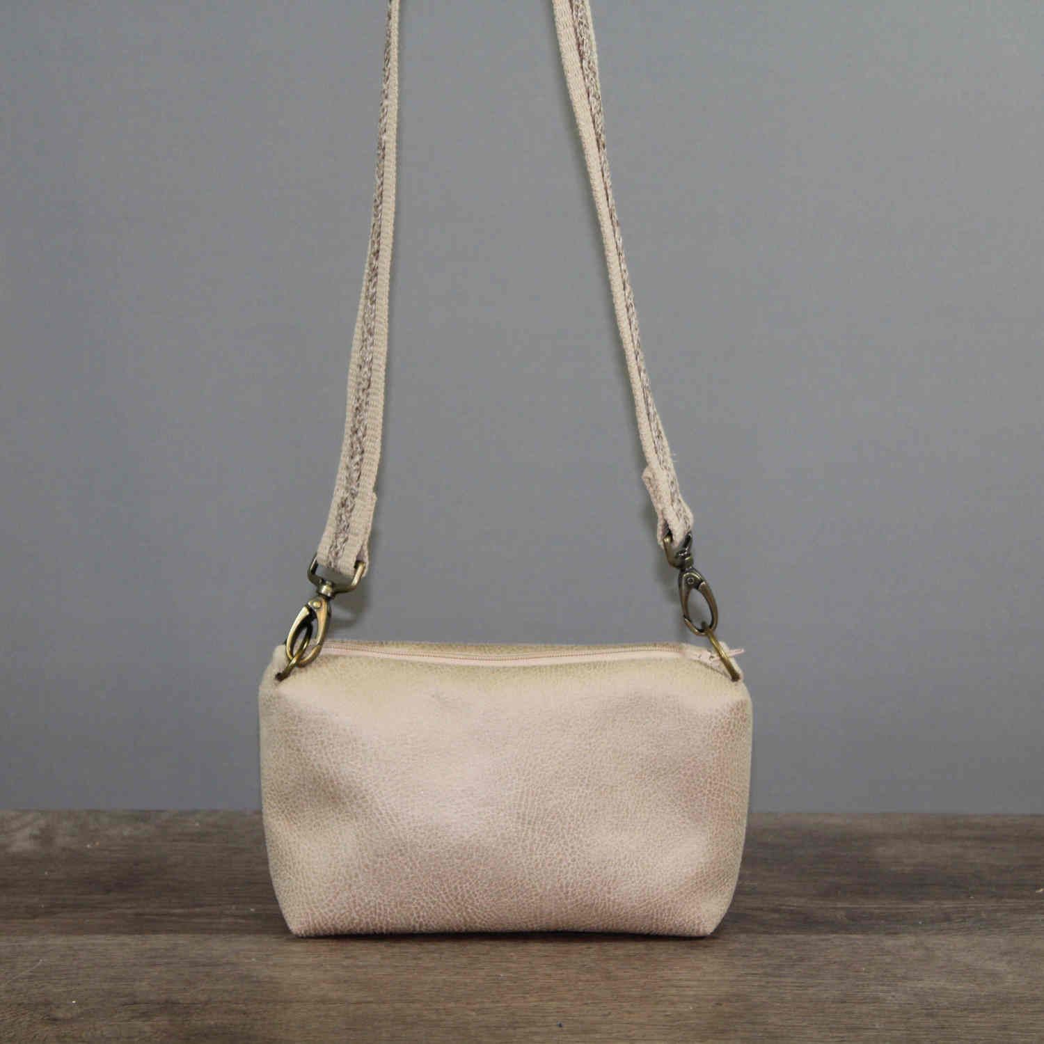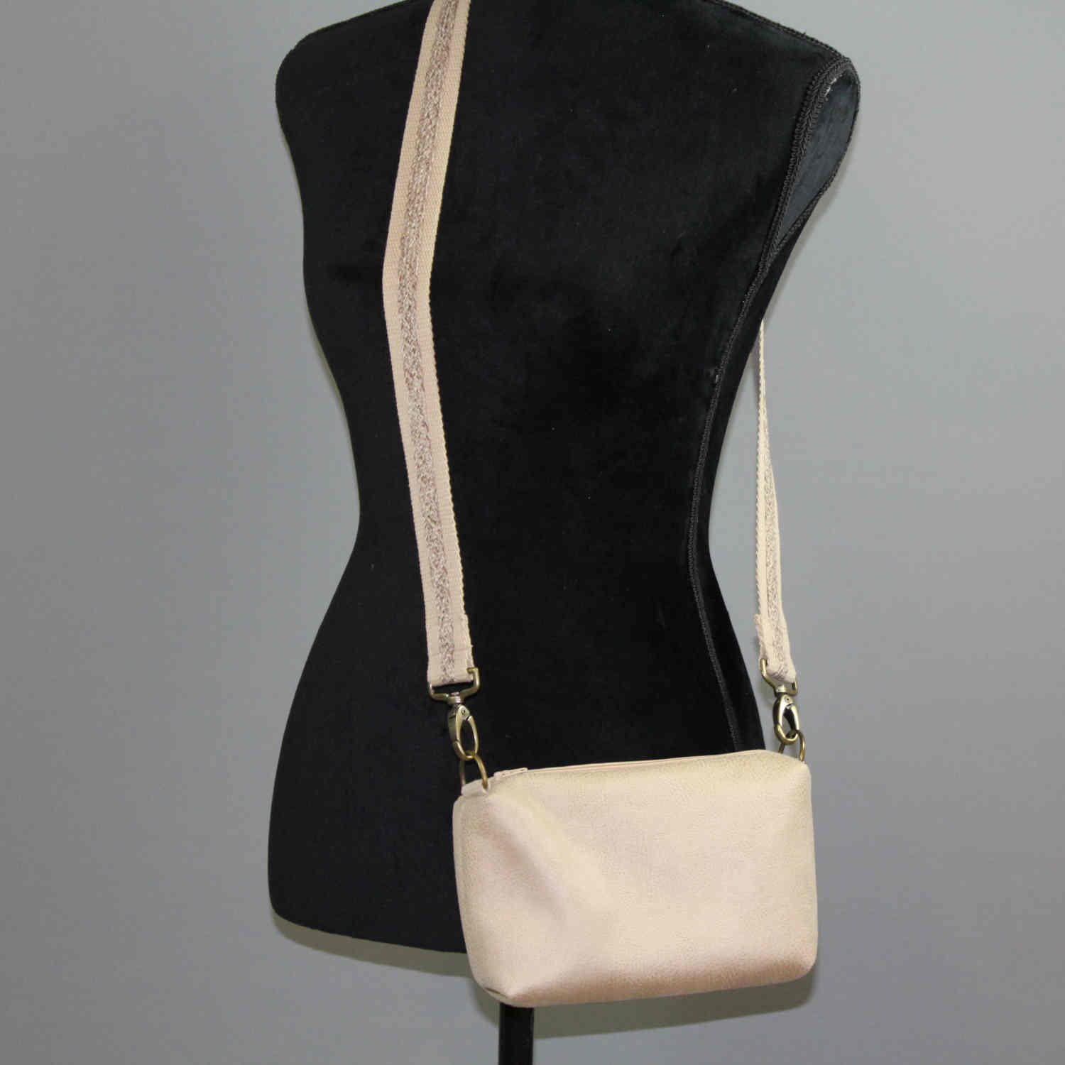 Gearbeitet aus einem weichen beigen Kunstleder. Das Gurtband wurde zusätzlich mit einem Schmuckband versehen, was eine tolle Wirkung hat. Mit einem Karabinerhaken ist der Gurt an  D-Ringen befestigt . Geschlossen wird die Tasche mit einem Reißverschluss. Volumenvlies sorgt für mehr Stabilität.
