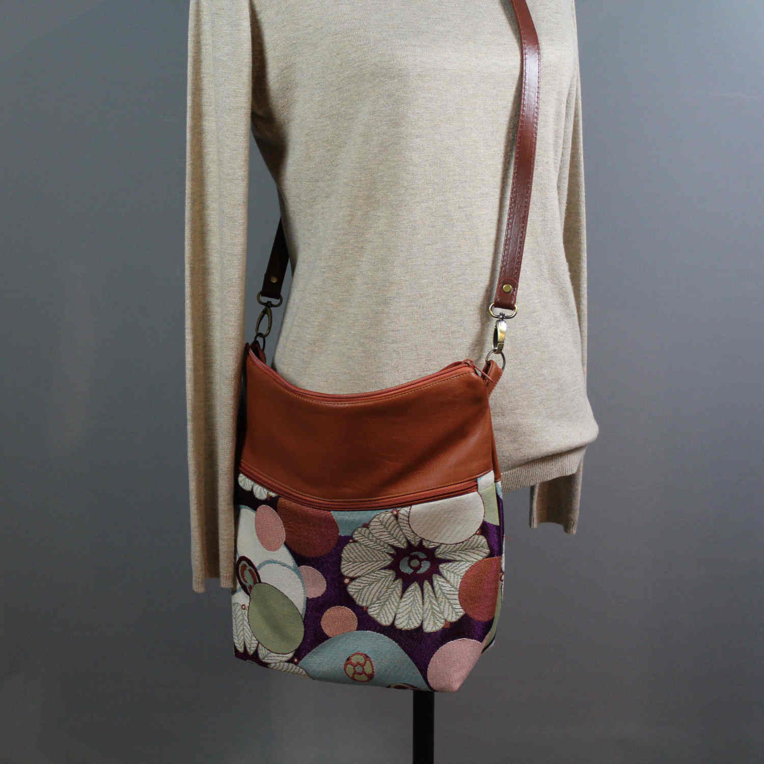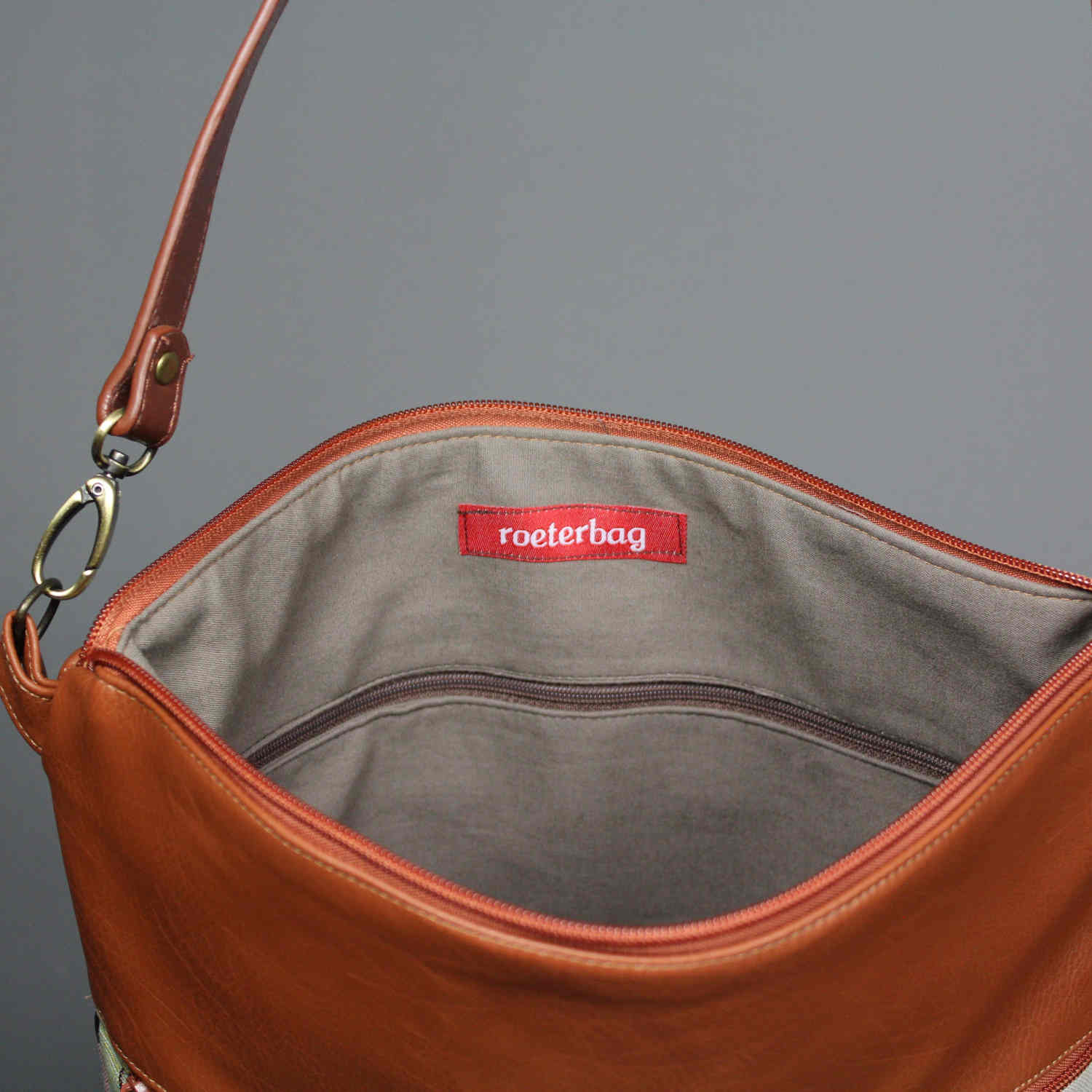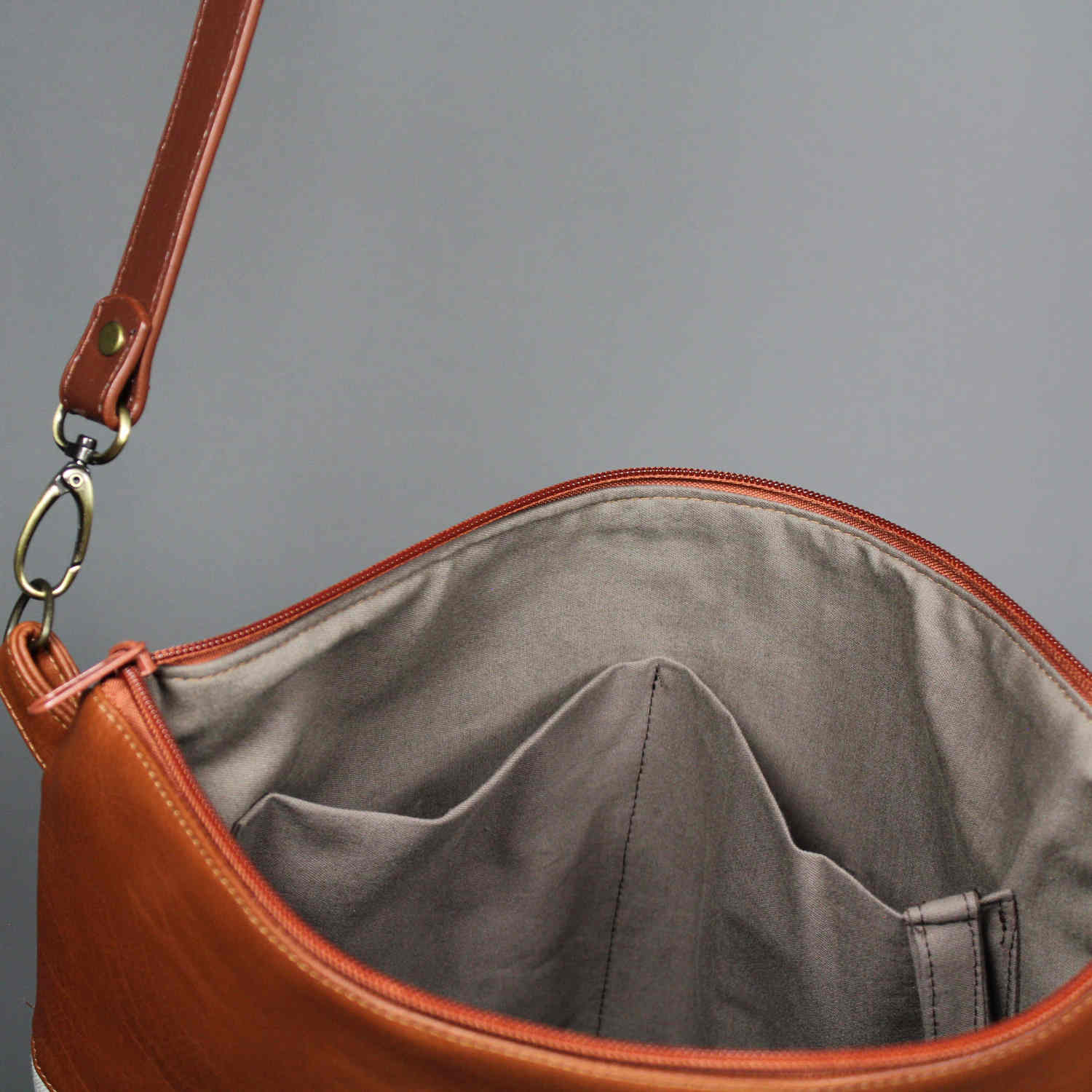 Ein Reißverschlussfach ist auf der Vorderseite der Tasche. der Ledergurt ist verstellbar.