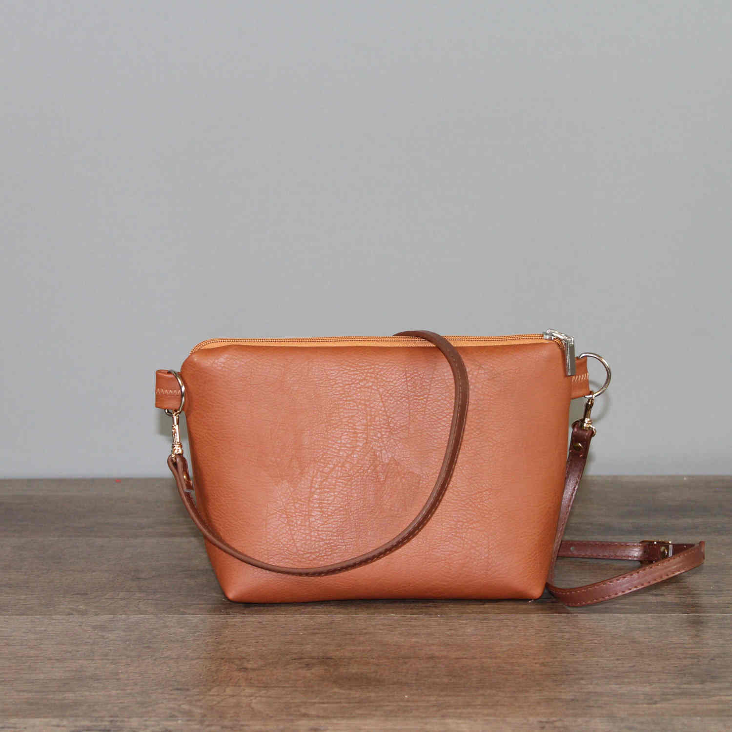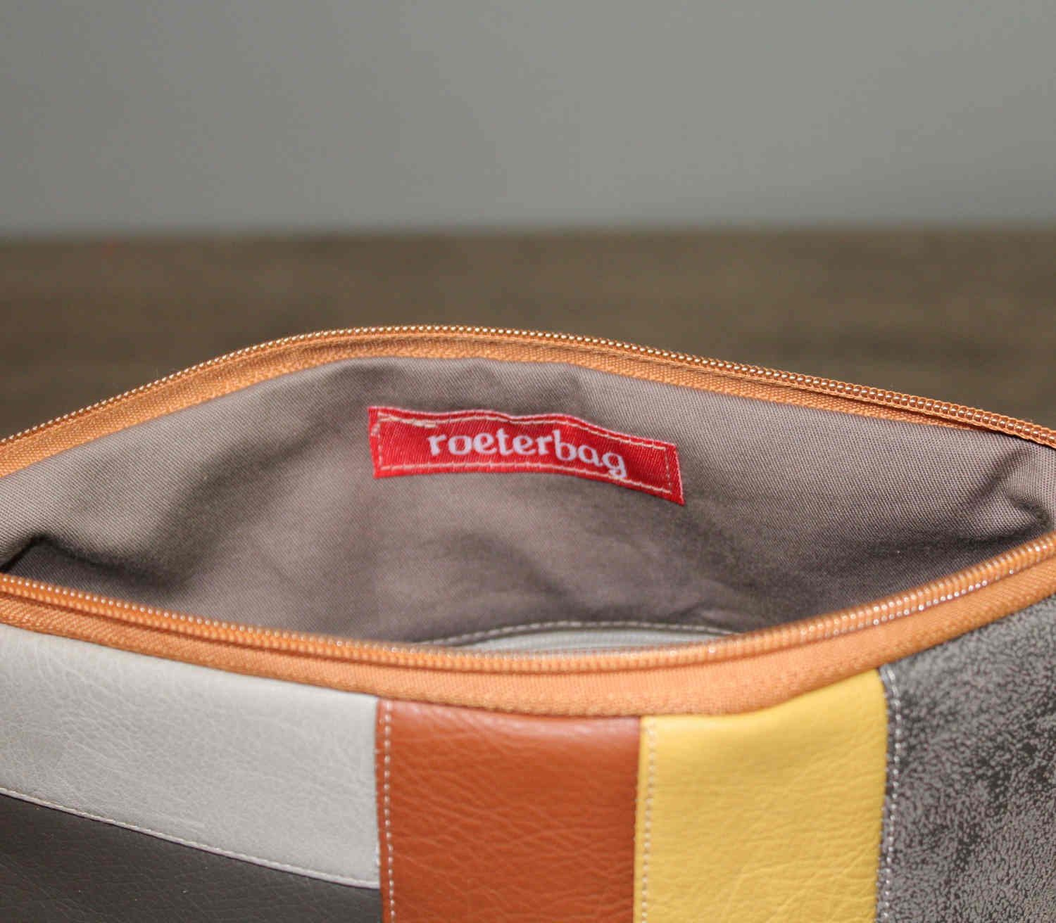 Die Rückseite ist aus einem hellbraunen Kunstleder. Im Innenfutter befindet sich zusätzlich eine kleine Reißverschlusstasche.