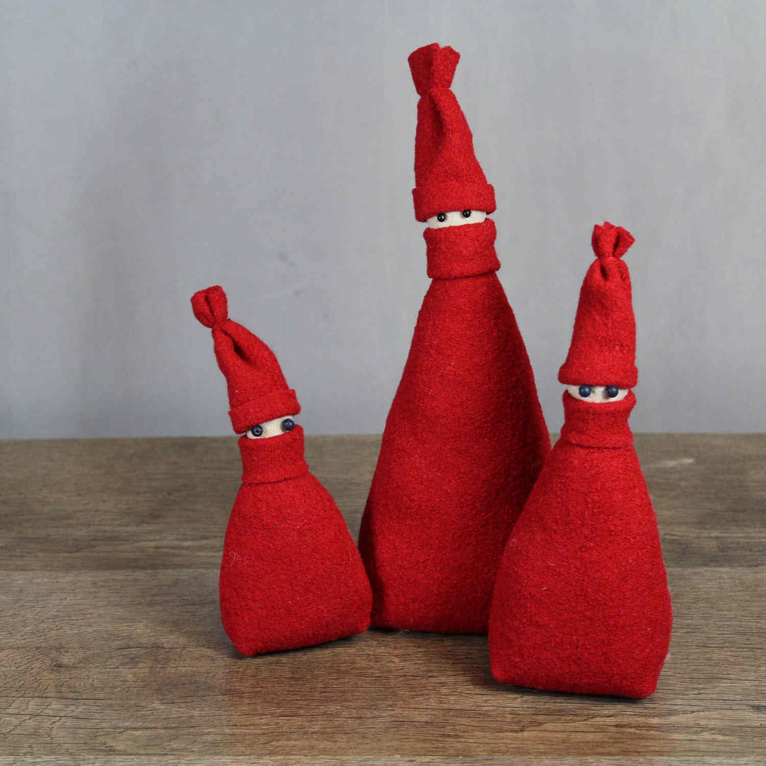 Sie wurden aus rotem Walkloden gemacht und haben die Größen 19, 24 und 29 cm. Mit Füllwatte und Granulat wurden sie gefüllt